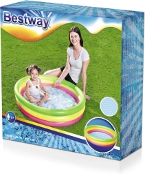 Színes gyerek felfújható medence a Bestway márkától forró napokon gyors felfrissülést és biztonságos vízi szórakozást kínál. A háromkamrás kialakításnak az erős PVC-nek és a puha, felfújható aljnak köszönhetően stabil, kényelmes és könnyen hordozható – ideális a kertbe, az erkélyre és nyaralásra is.