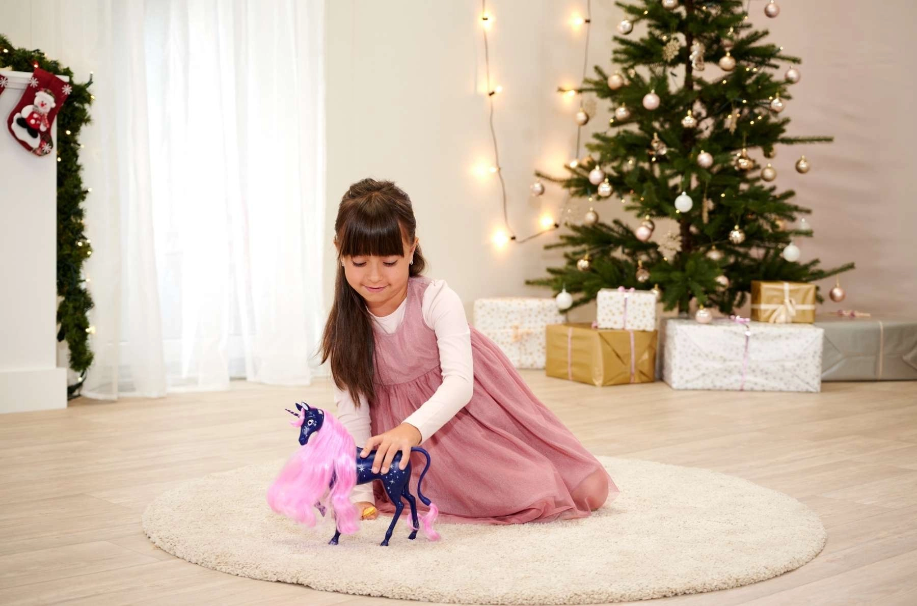 Az unikornis testét borító csillagok fényben feltöltődnek, és lekapcsolt világításnál gyönyörűen ragyognak. Az éjszakai égbolt hatása varázslatos hangulatot ad a játéknak.