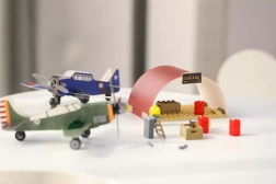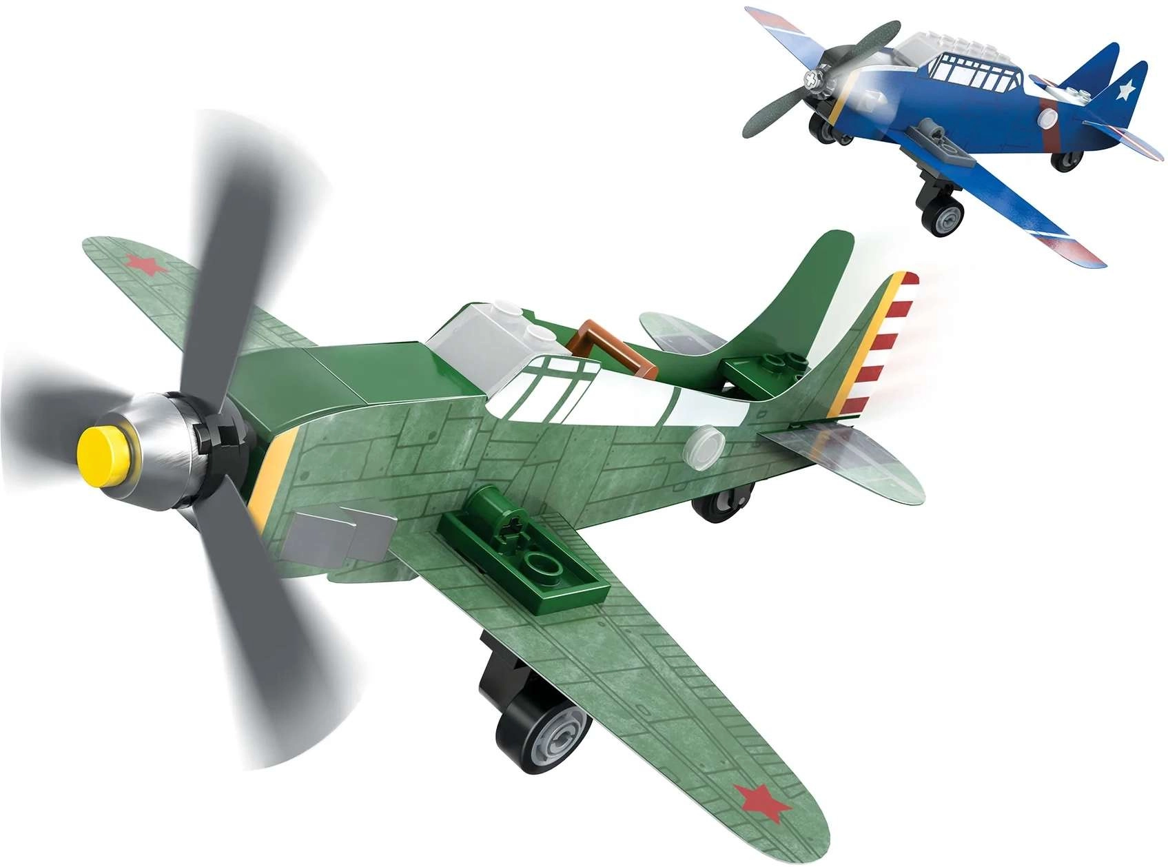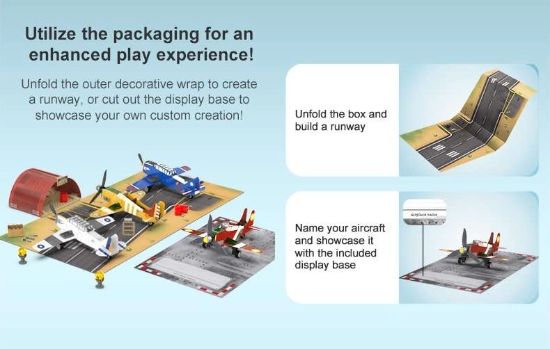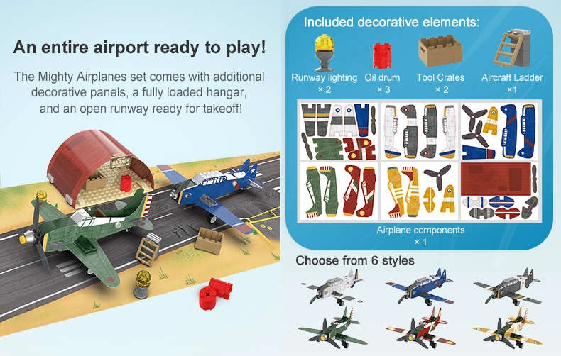 - kockák, 8× klipszes kocka, 20× papír repülő-komponens, 2× leszállópálya-világítás, 3× olajos hordó, 2× szerszámos láda, repülőlétra, útmutató