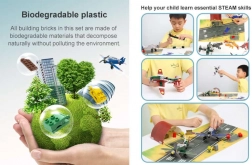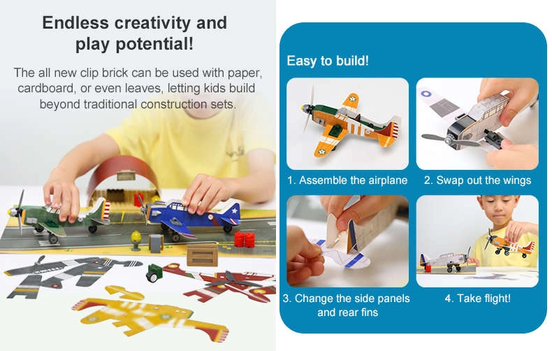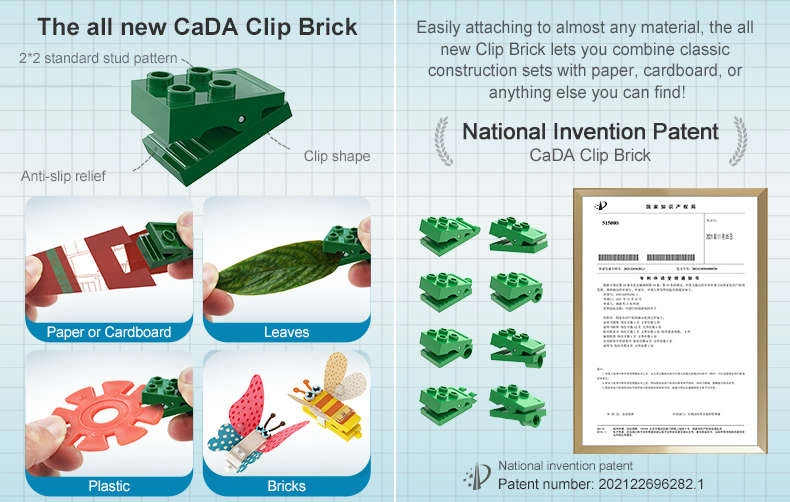 A csomagban klipszes kockák is vannak, amelyek papírhoz vagy szövethez rögzíthetők, így a gyerekek a standard kockaelemeken túl is alkothatnak. A doboz kifutóként vagy állványként is használható a kész modellek kiállításához. Az elemek kompatibilisek más CaDA szettekkel.