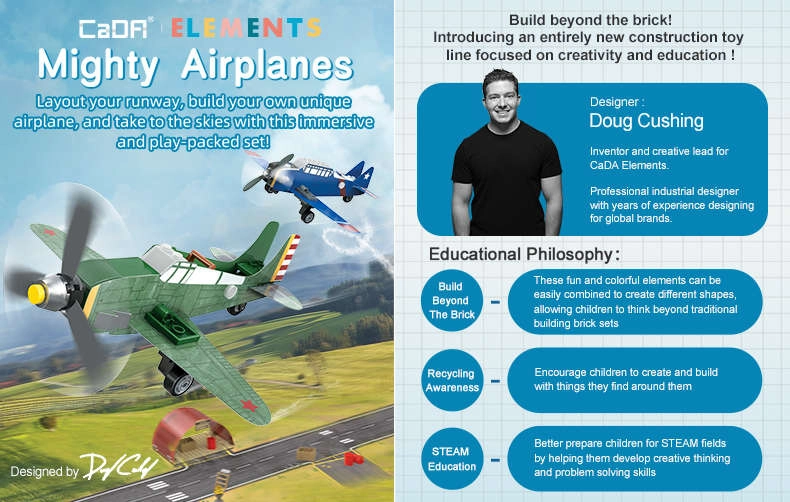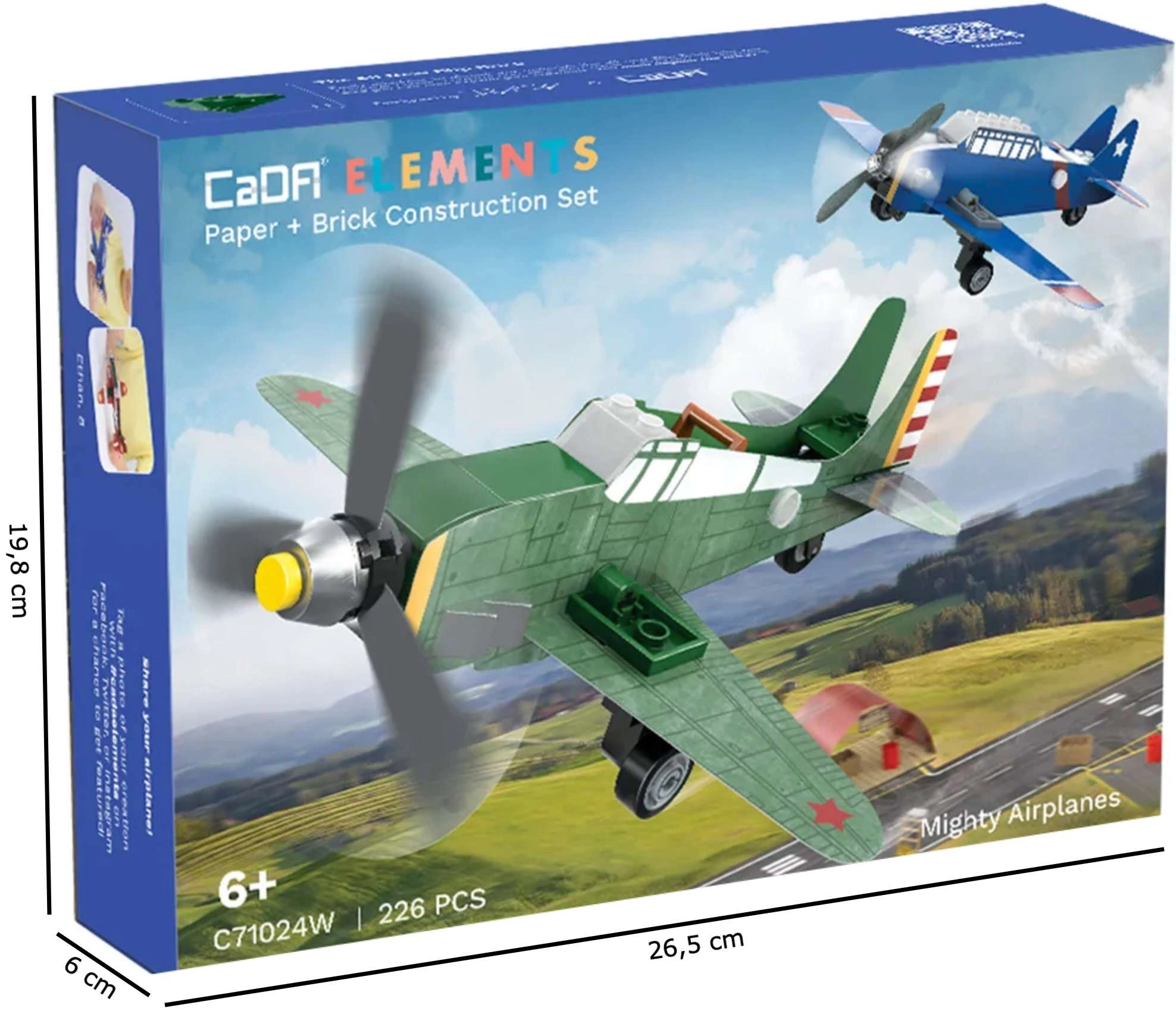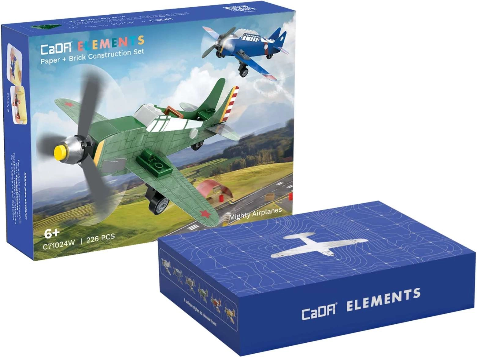 A CaDA Elements építőkészlet fejleszti a fantáziát és a műszaki gondolkodást. A két egyedi légkeretnek és a 6 szett dekoratív panelnek köszönhetően egyedi repülők születnek a papír és építőkockák kombinációjából. A szett része a leszállópálya és tematikus kiegészítők a valósághű jelenetekhez.