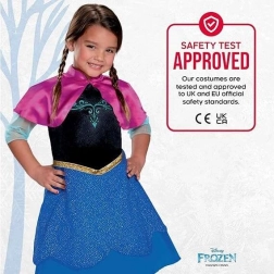 Elbűvölő Disney Frozen Anna gyermek jelmez kislányoknak, 109–123 cm magassághoz. Könnyű és kényelmes ruha kék és szatén fekete árnyalatokban, amelyet rövid rózsaszín pelerin egészít ki. Ideális farsangra, jelmezbálra, valamint otthoni és szabadtéri játékhoz. Hivatalosan licencelt DISNEY termék, a Disguise márkától.