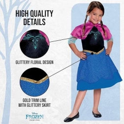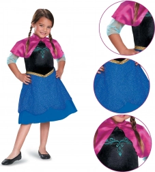 A szett tartalmaz kék és szatén fekete tónusú ruhát és egy rövid rózsaszín pelerint, amelyek hűen idézik Anna megjelenését. A jelmez 5–6 éves gyerekeknek készült, 109–123 cm magassághoz illeszkedik.