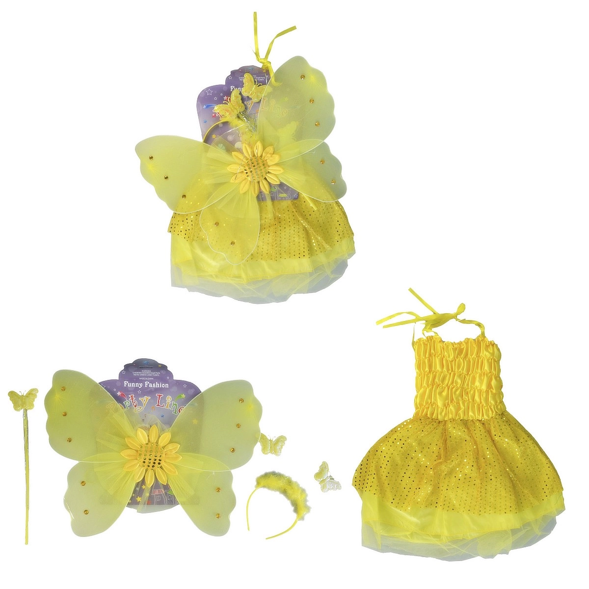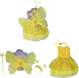 Változtasd gyermeked vidám napraforgóvá! Ez a sárga jelmez úgy lett tervezve, hogy kényelmes, feltűnő és játékos legyen. A szett finom szárnyakkal ellátott ruhát, hozzáillő fejpántot és varázspálcát tartalmaz – tökéletes kombináció farsangra, iskolai előadásokra vagy otthoni játékra.