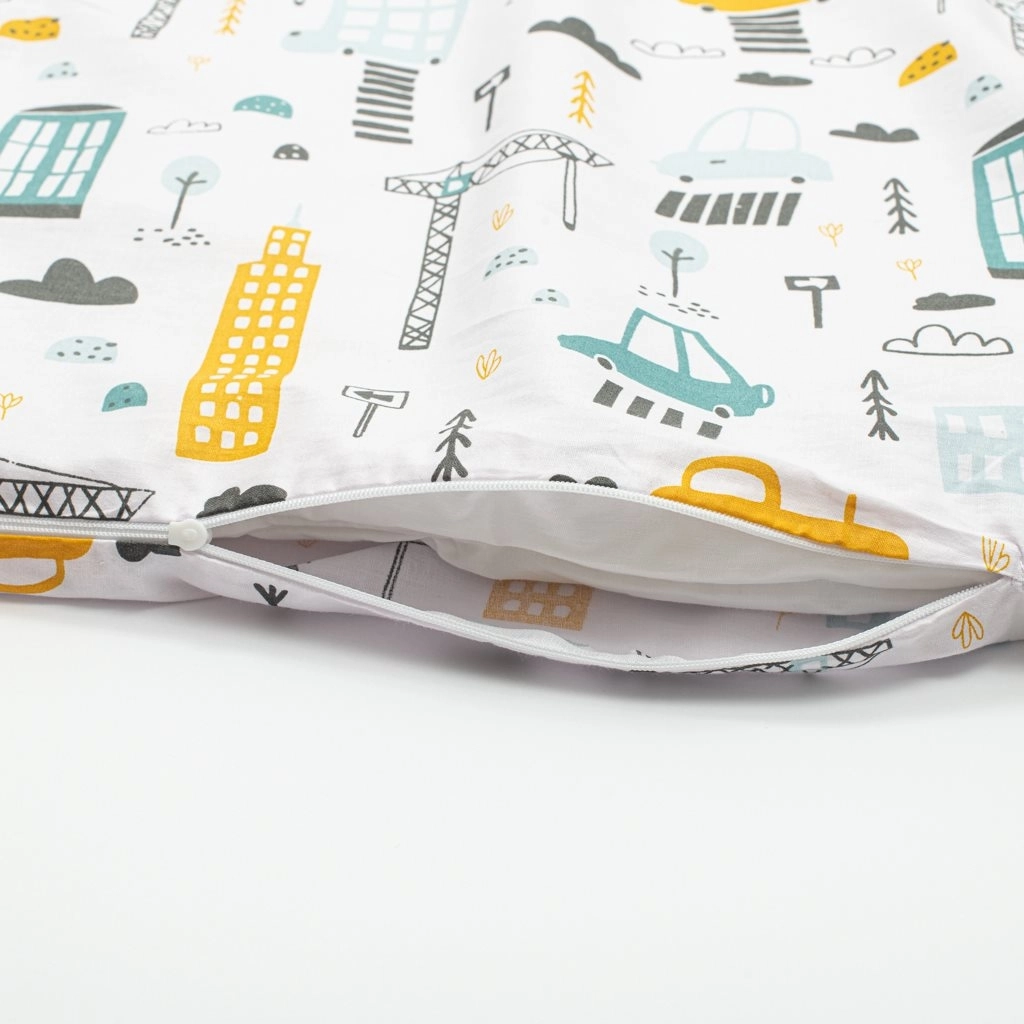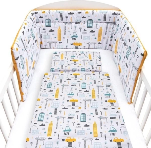 Kényelmes és biztonságos 3 részes NEW BABY kiságy ágyneműgarnitúra mustár színű Város motívummal. Tartalmaz egy 40×60 cm-es párnahuzatot, egy 120×90 cm-es paplanhuzatot és egy 31×175 cm-es rácsvédőt. 100% pamutból készült a puhaság, a légáteresztés és az érzékeny bababőr kímélése érdekében. Praktikus, biztonságos cipzárak lelógó vég nélkül és antiallergén anyagok a nyugodt és biztonságos alvásért.
