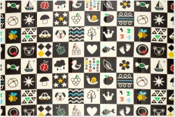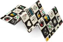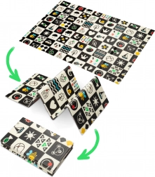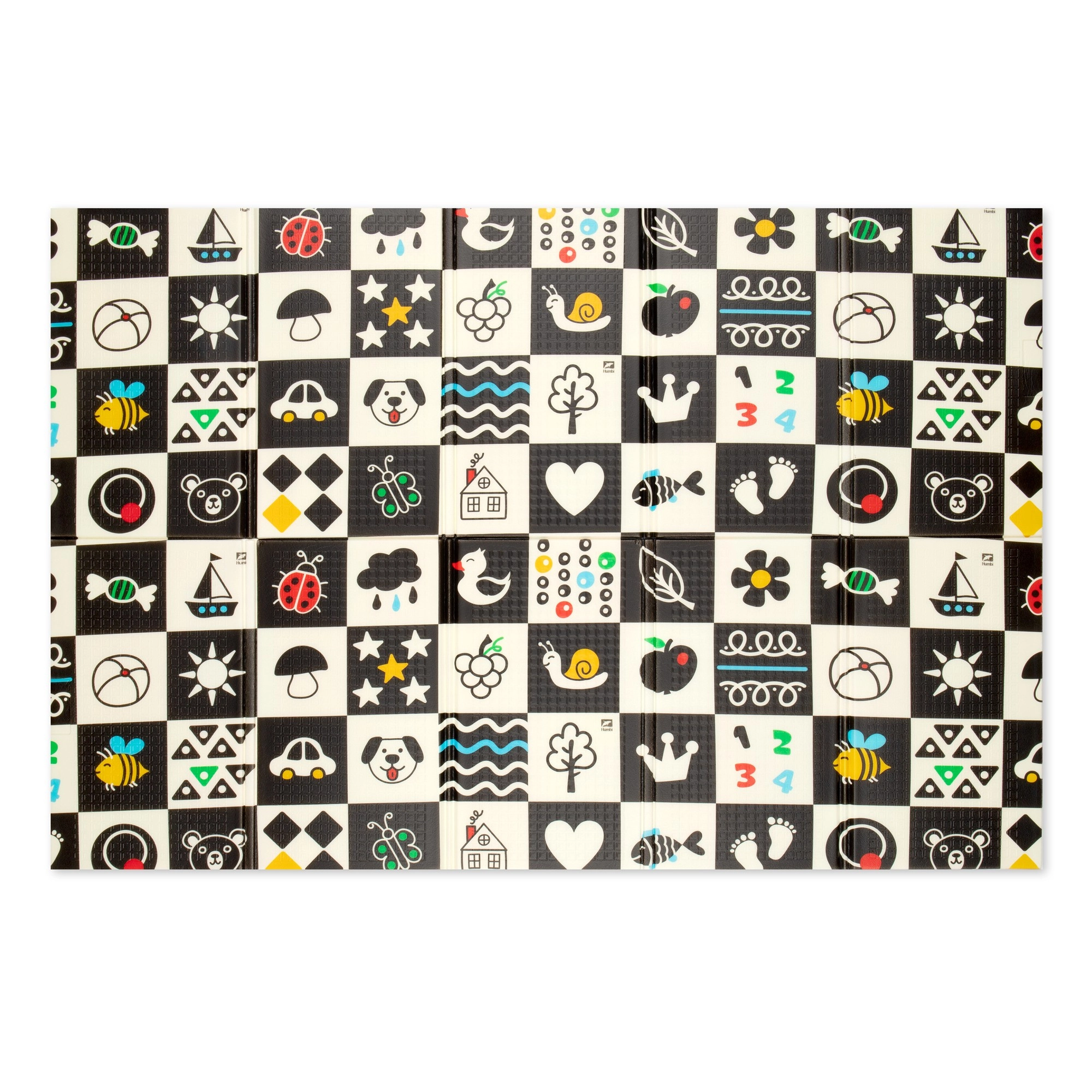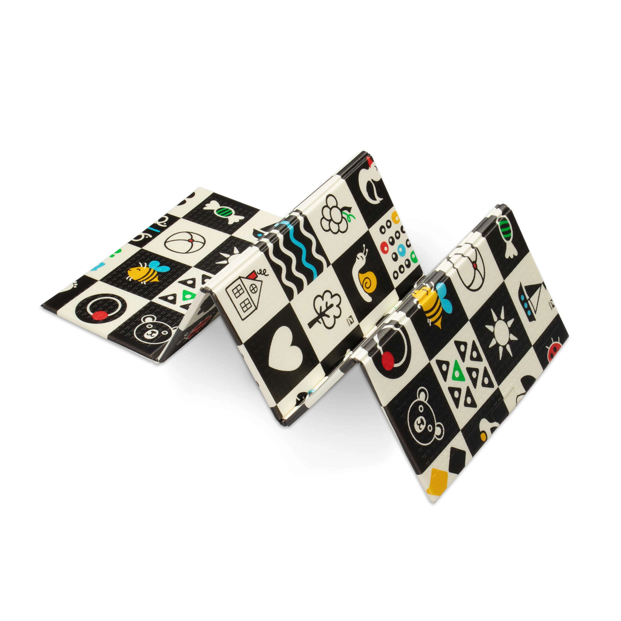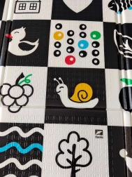 Az egyik oldal kontrasztos ikonokkal a babák látásának stimulálására, a másik színes motívumokkal a tanuláshoz és felfedezéshez. Hangulattól függően egyszerűen fordítsa meg.