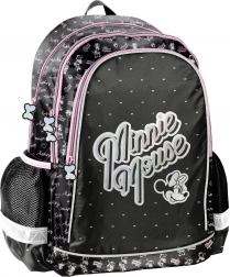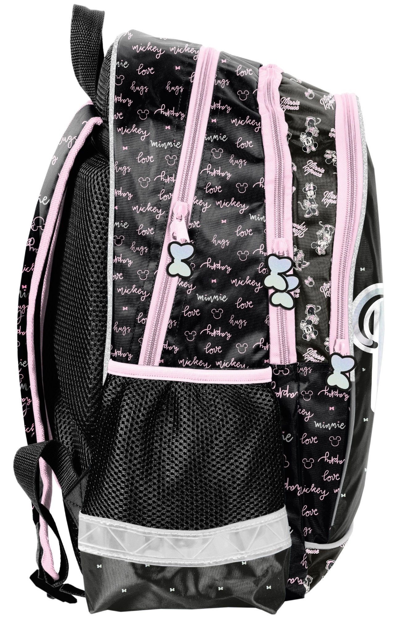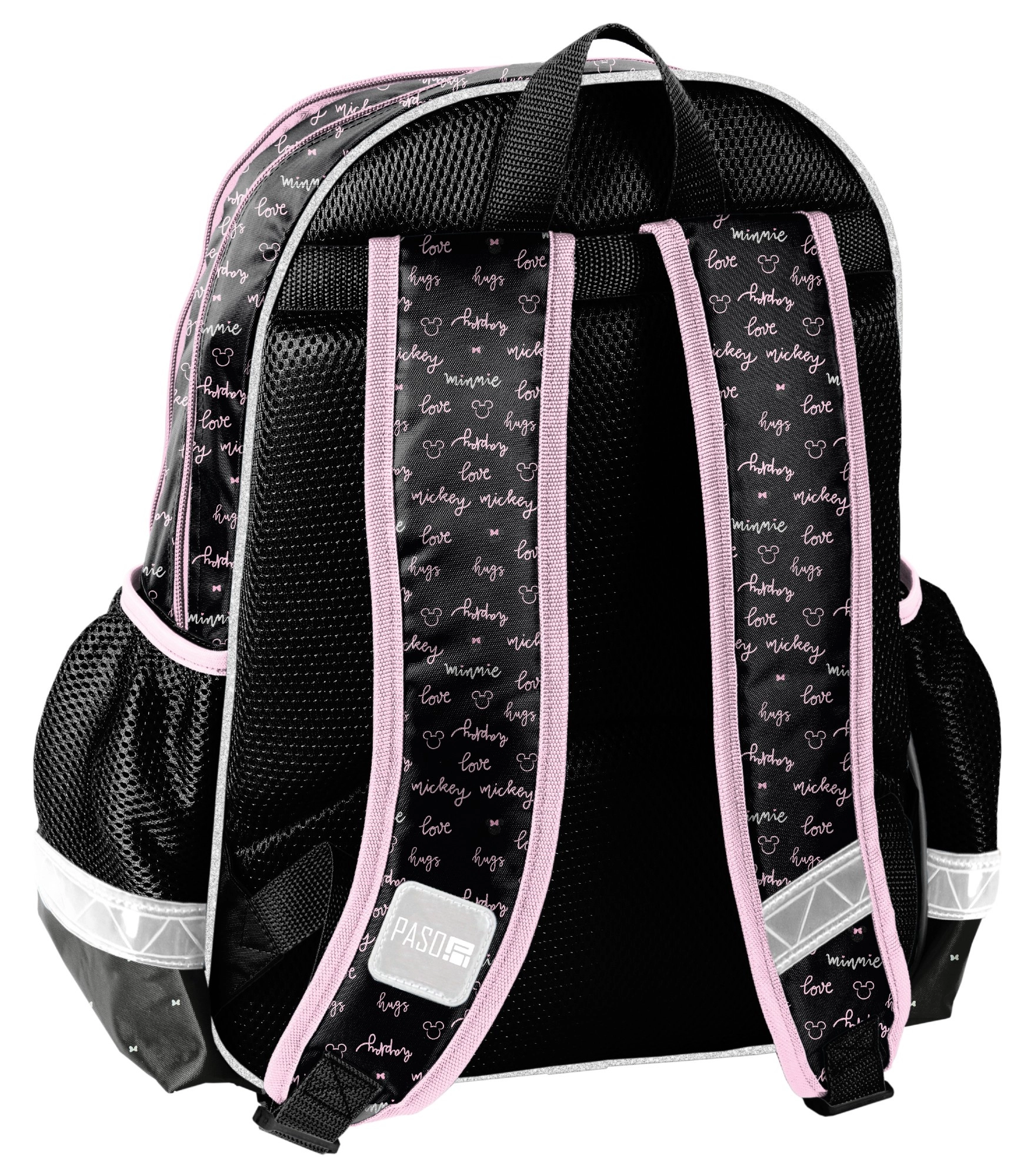 Stílusos iskolatáska fekete–rózsaszín kivitelben MINNIE MOUSE mintával, a Paso márkától. Kínál könnyű szerkezetet, megerősített és formázott hátkiképzést, ergonomikus, párnázott vállpántokat, valamint fényvisszaverő elemeket a nagyobb biztonságért. Két fő rekesz, elülső zseb és oldalsó hálós zsebek gondoskodnak az iskolai felszerelés áttekinthető elrendezéséről.