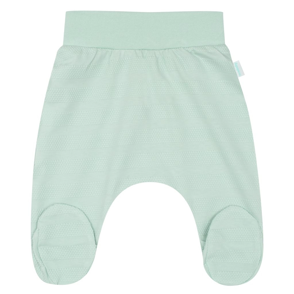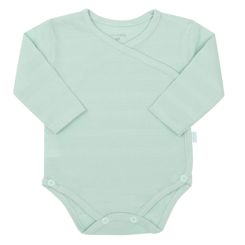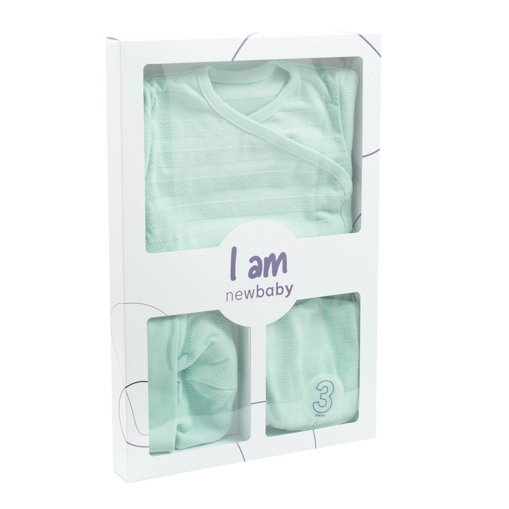 Aranyos 3 részes baba szett NEW BABY I AM menta színben, ideális a kórházba és az első hónapokra. Tartalmaz keresztezve záródó, hosszú ujjú bodyt, lábfejes nadrágot és sapkát puha, 100% pamutból. A kényelmes oldalsó patentos záródás megkönnyíti az öltöztetést, a széles rugalmas derékrész nem nyomja a pocakot, a puha sapka jól tart a fejecskén. Öko díszdobozban szállítva.