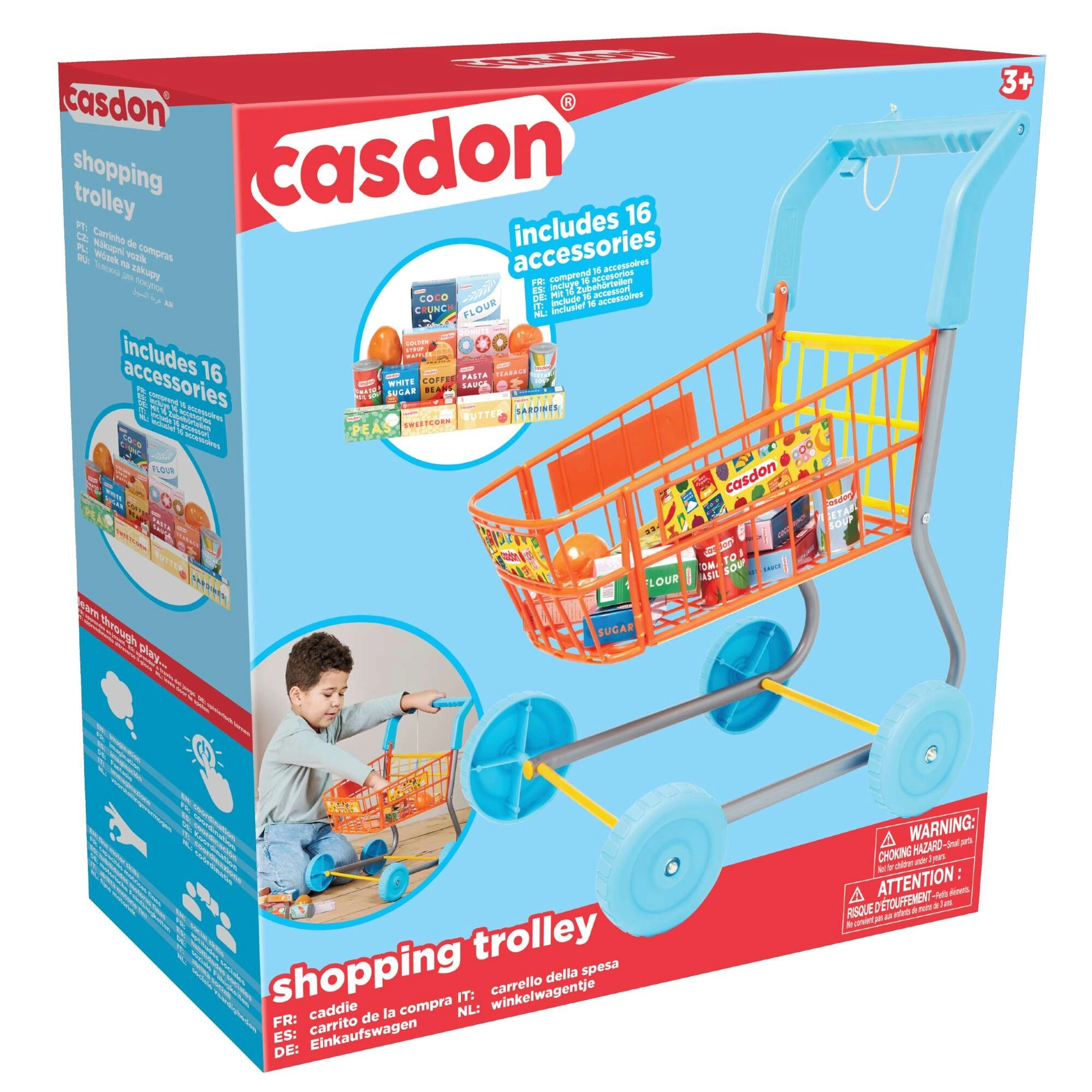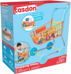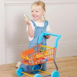 A csomagban 16 valósághűen nyomtatott doboz és konzerv található élelmiszerrel, valamint műanyag gyümölcs/zöldség, amelyek segítik a gyerekeket a válogatás, számolás és szociális készségek gyakorlásában a boltos játék során. A fogantyúnál egy kis síp/zseton lóg, a még autentikusabb vásárlási élményért.