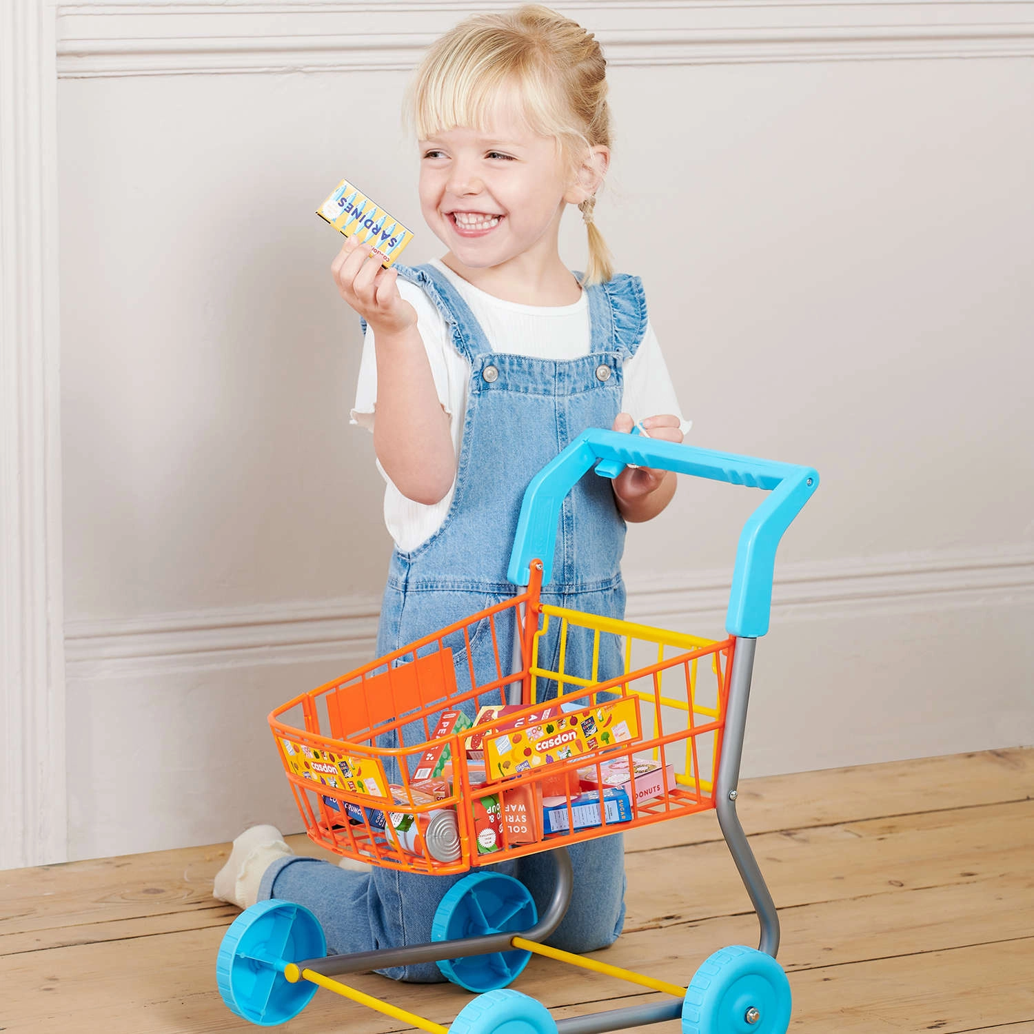 Ez a gyerek bevásárlókocsi remek választás kis eladóknak és vásárlóknak. A narancssárga kosár, a kék fogantyú és kerekek, valamint a sárga részletek kombinációja vonzó megjelenést ad, és támogatja a kreatív játékot. A széles kerekek stabilitást és könnyű beltéri manőverezést biztosítanak.