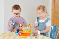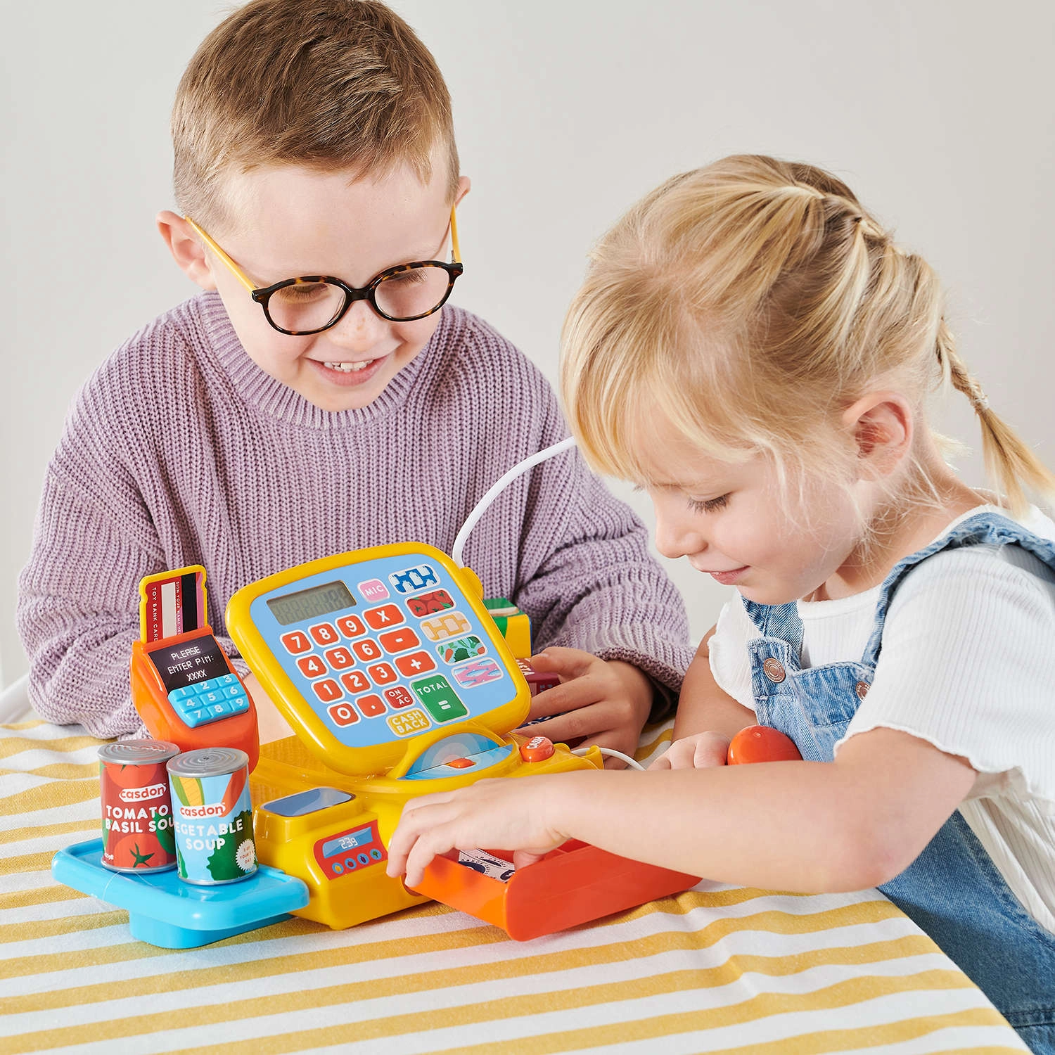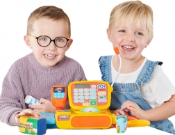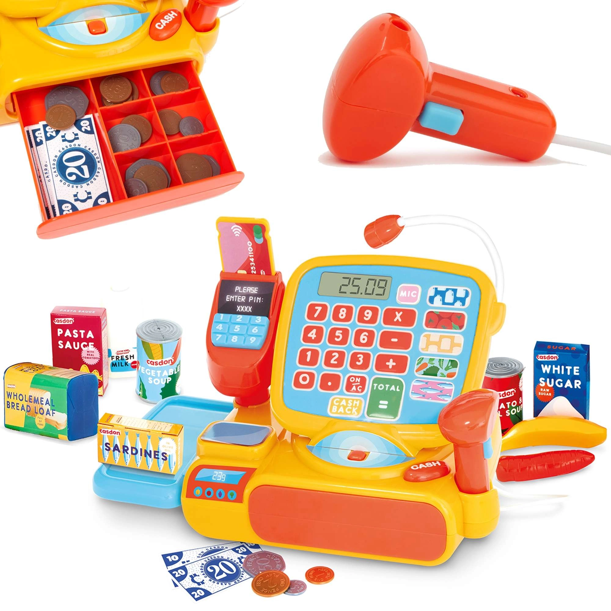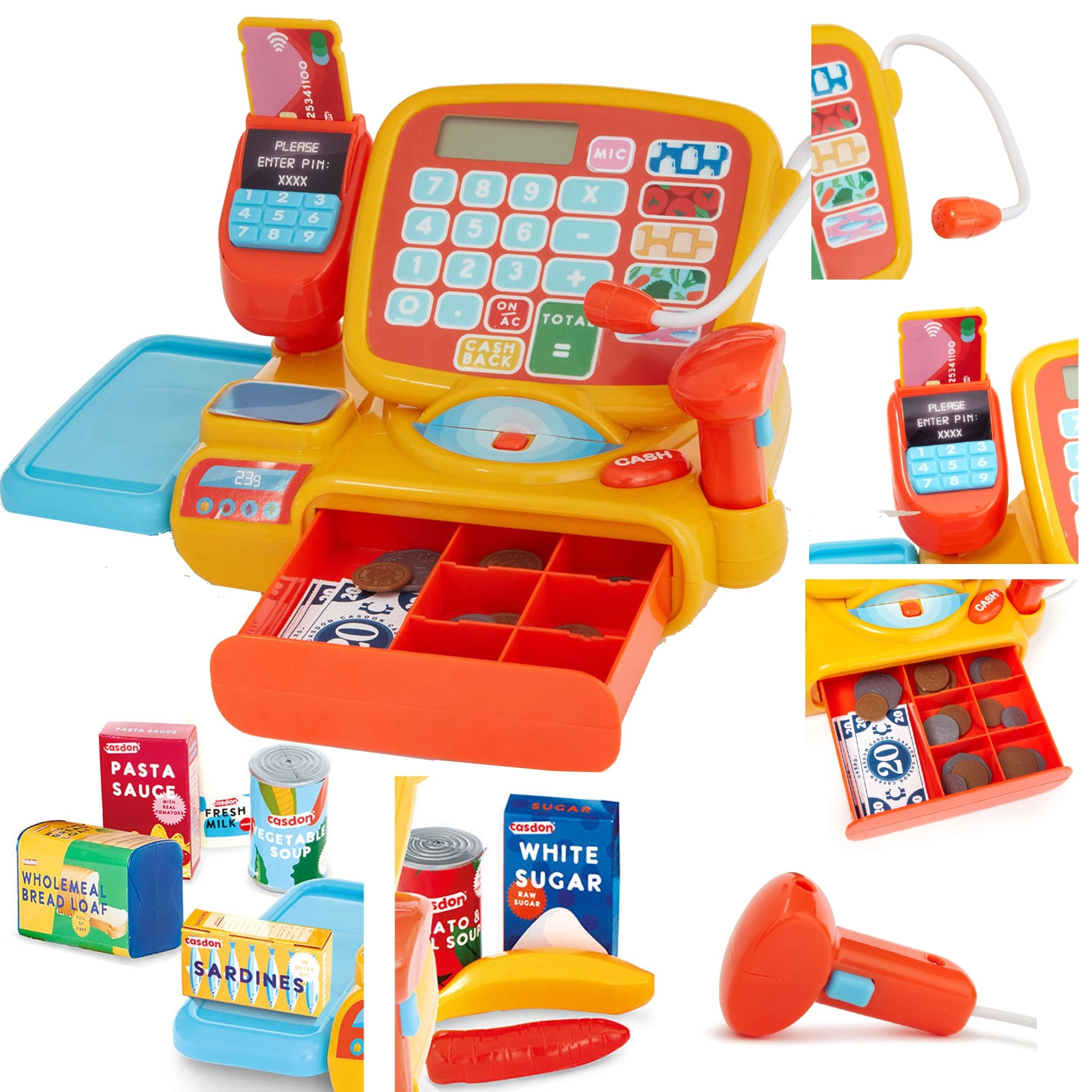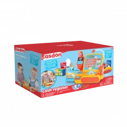 A színes CASDON gyerek pénztárgép valósághű boltos játékot kínál gazdag tartozékokkal. Van benne működő kijelző számológéppel, vonalkódolvasó szkenner, kártyaolvasó, mérleg és kihúzható pénzfiók. A csomagban bankjegyek, érmék, fizetőkártya és élelmiszer-makettek találhatók. Hangeffektek és mikrofon gondoskodnak a még valóságosabb élményről.