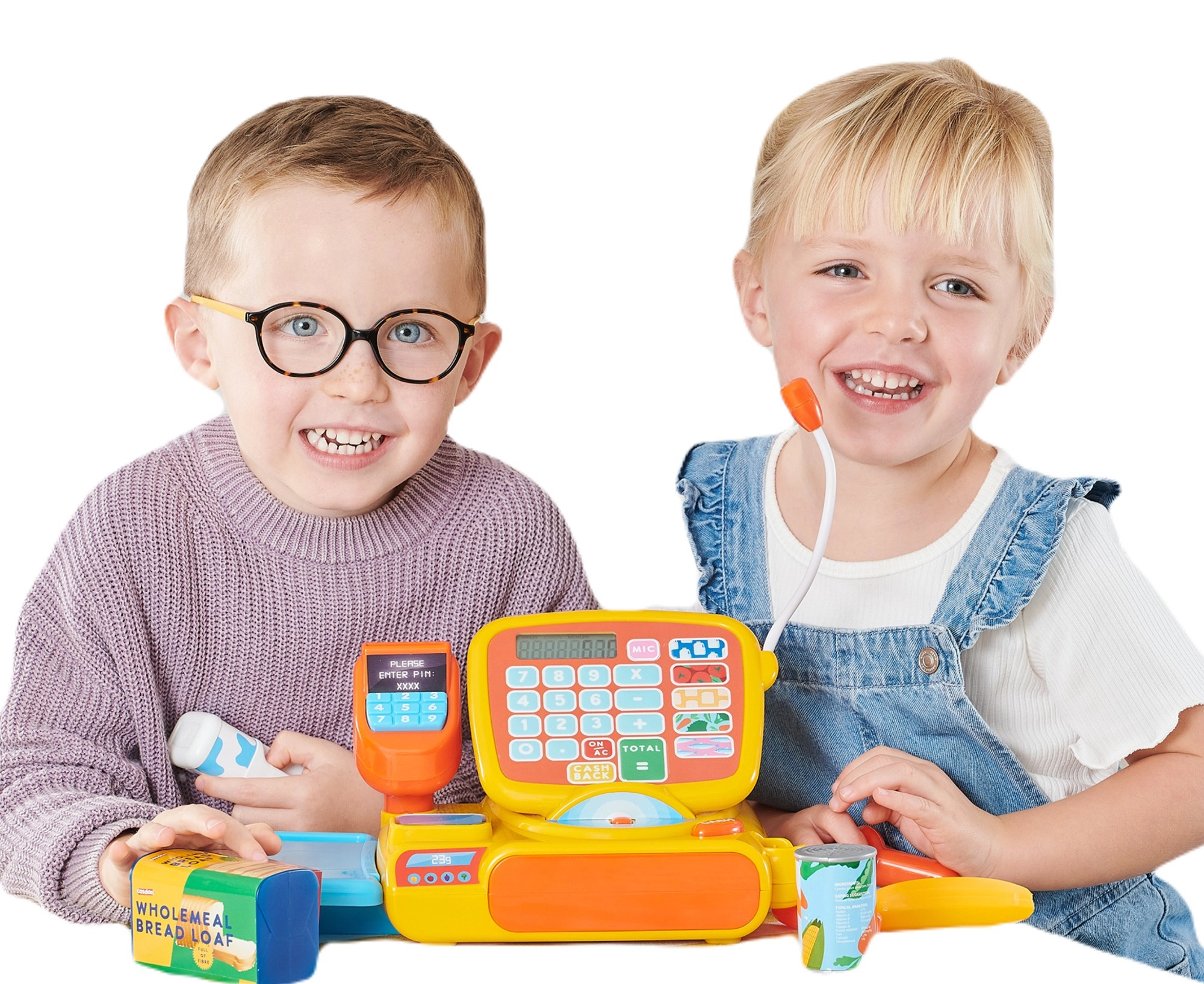 Fedezd fel a pénztáros szerepjátékot a lendületes színekben pompázó CASDON gyerek pénztárgéppel. A gyerekek leolvashatják az árut, összeadhatják a vásárlást a jól olvasható billentyűzetű számológépen, fizethetnek kártyával vagy készpénzzel, és kommunikálhatnak a működő mikrofonnal. A valósághű hangeffektek szkenneléskor és kártya behelyezésekor támogatják a képzelőerőt, a számok tanulását és az alapvető pénzügyi ismeretek elsajátítását.