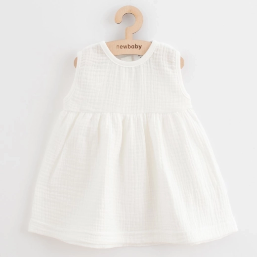 Pehelykönnyű és légáteresztő New Baby Elizabeth muszlin gyermekruha a kis parádésoknak. Ujjatlan, A-vonalú fazon, megemelt, ráncolt szoknyával és hátul patentos záródással az egyszerű öltöztetésért. 100% pamut muszlinból készült, amely puha, selymes és kíméletes a bababőrhöz.