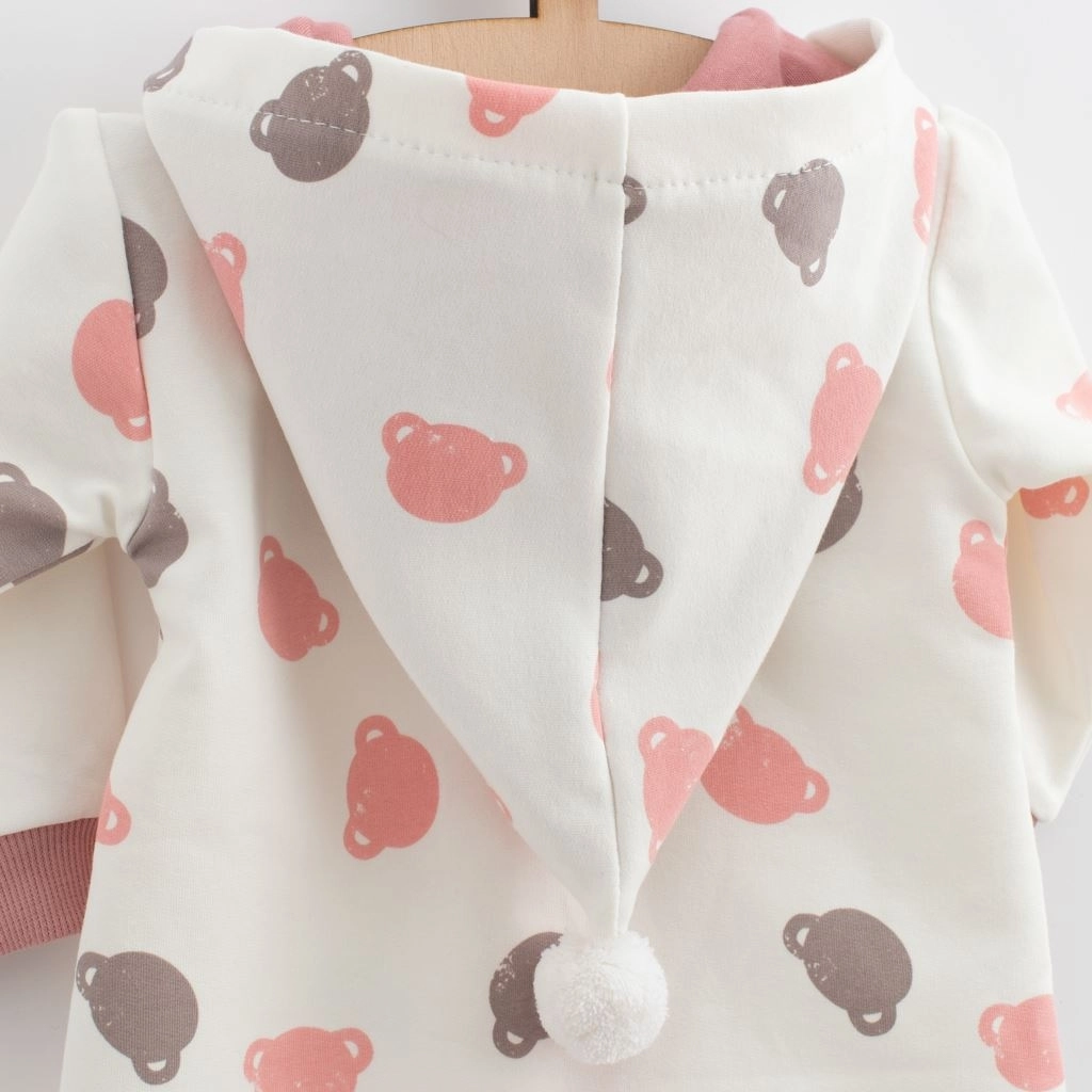Aranyos és praktikus baba kapucnis overál NEW BABY Little One rózsaszín színben, egész éves viselésre ideális. Kínál puha melegítő anyagot, teljes felületű macimintát, telihosszú cipzáras zárást és rugalmas passzékat a tökéletes kényelemért.