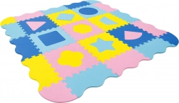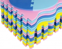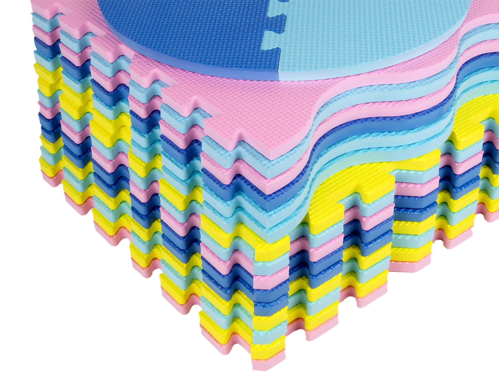 Az EVA anyag vízálló és könnyen tisztítható – elég nedves ruhával áttörölni. A szőnyeg nem fogja meg a port és az atkákat, ezért ideális a gyerekszoba tiszta, egészséges környezetéhez. A semleges, mégis kontrasztos színek (világos és sötétkék, sárga, rózsaszín) illenek az enteriőrhöz, és támogatják a gyermek koncentrációját.