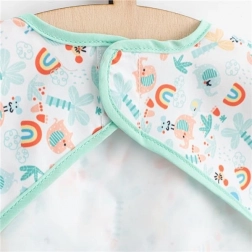 A té pőzáras zárás megkönnyíti a gyors fel- és levételt, míg a puha elülső zseb felfogja a morzsákat és a cseppeket. A kötény ideális etetéshez, önálló evéshez és kreatív tevékenységekhez. A modern minták és a zöld szín a gyerekeknek és a szülőknek is tetszeni fog.