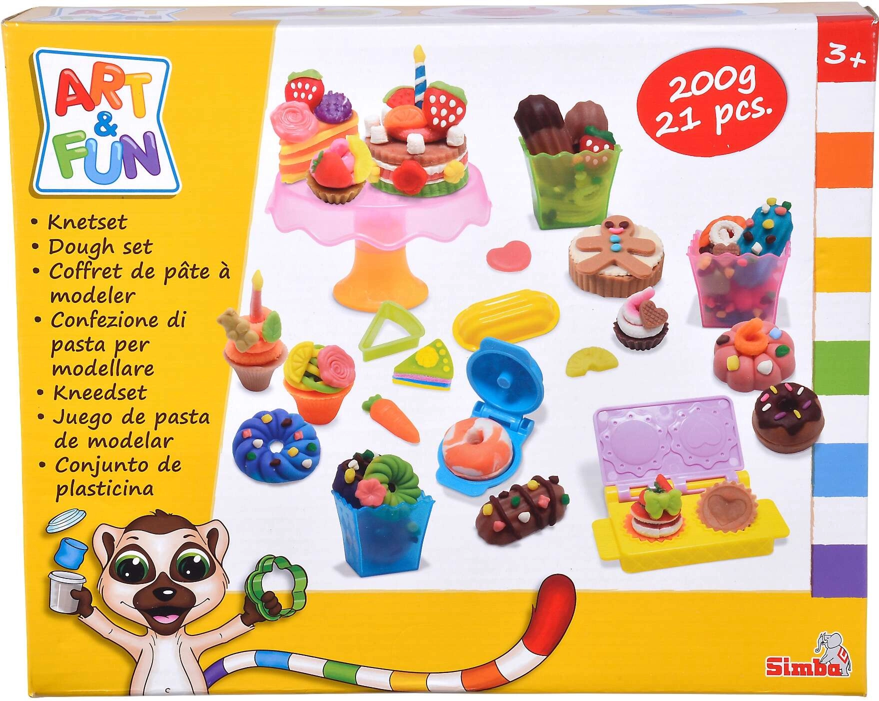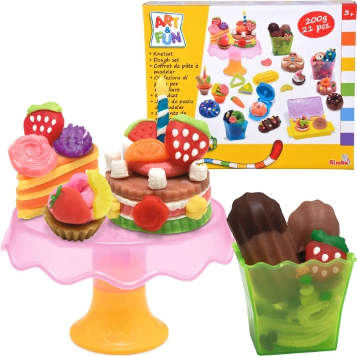 Készíts édes alkotásokat sütés nélkül! A Simba márka Art&Fun sorozatának kreatív szettje 200 g gyurmát 6 színben és bőséges formákat és fejeket kínál tortácskákhoz, fánkokhoz, fagyikhoz és mázakhoz. Szórakozás, amely fejleszti a fantáziát és a finommotorikát, és lehetővé teszi a gyerekeknek, hogy stílusosan kiállítsák „desszertjeiket” a bájos poharakban és tálkákban.