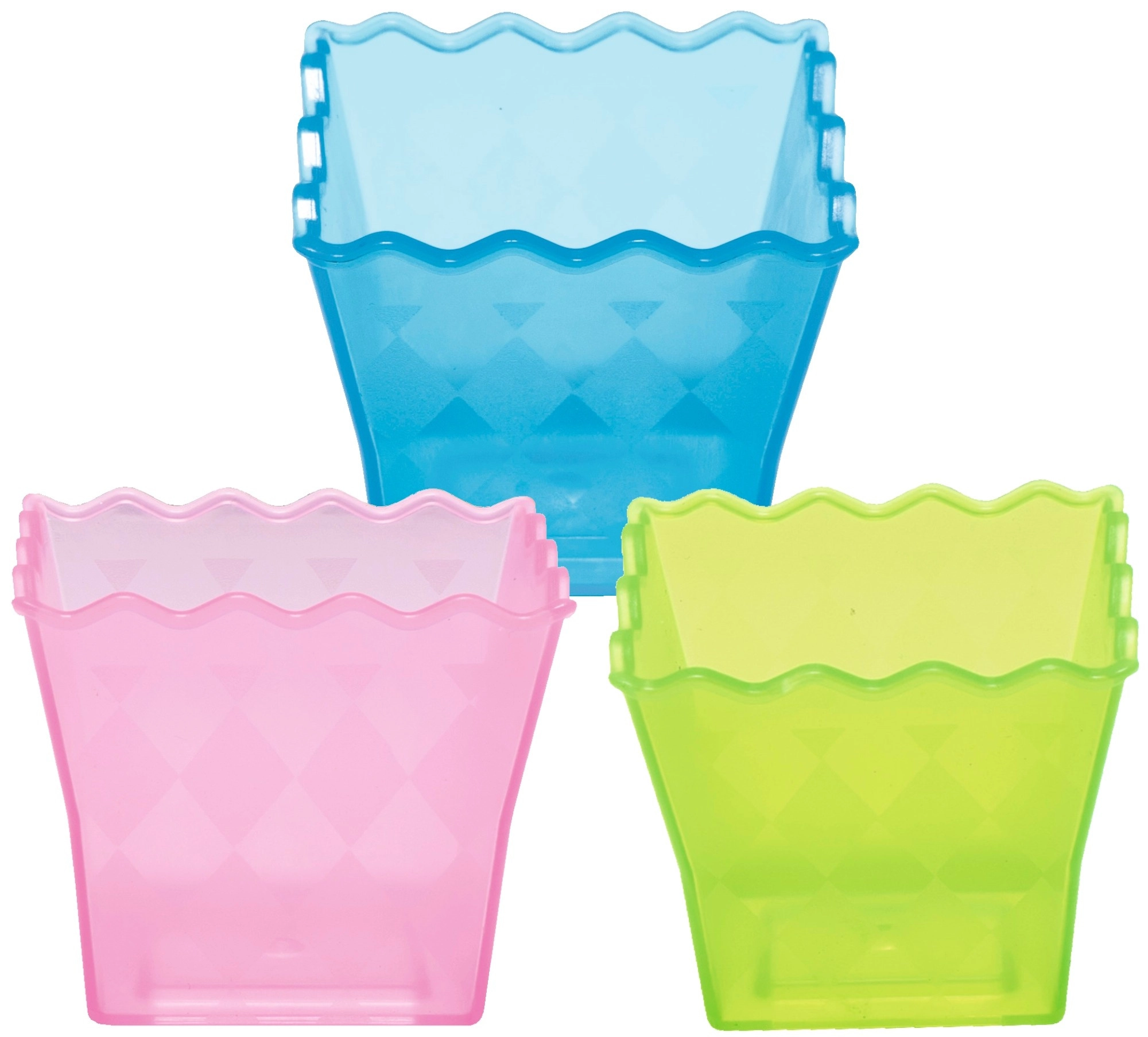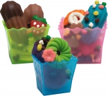 Átlátszó, színes edénykék segítenek az elkészült alkotások áttekinthető kiállításában és könnyű tárolásában. A rakásolható kialakítás helyet takarít meg.