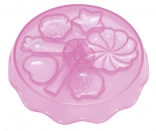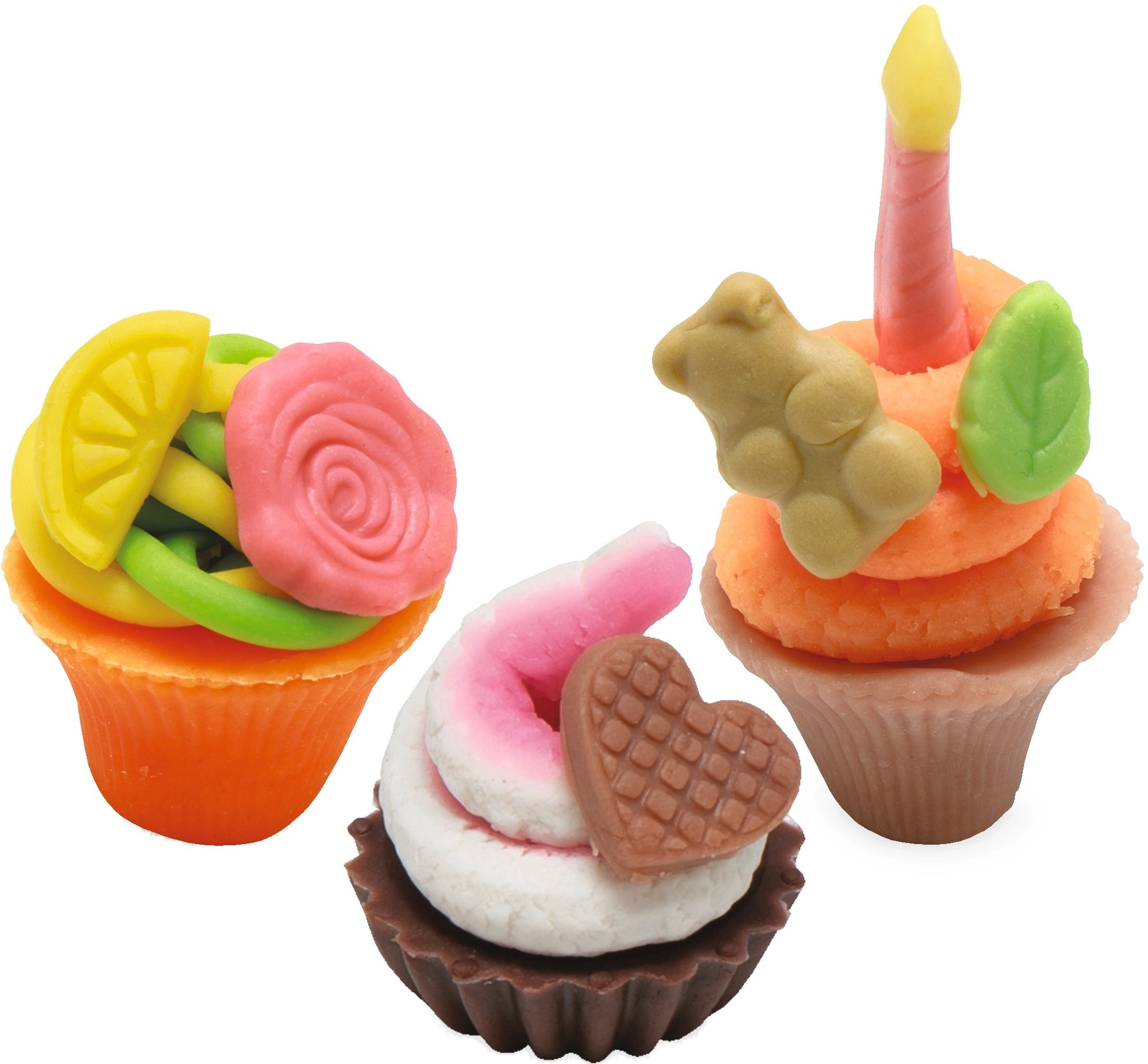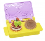 - 200 g gyurma (6 szín), muffin/keksz/fánk formák, prés fejekkel, poharak és edénykék, dekoráló formák