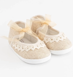 Aranyos újszülött babacipők a New Babytől, a legkisebbeknek, fűzős, lány szandál stílusban. Nagyon könnyűek, széles belső térrel a lábujjak szabad mozgásához és vékony szintetikus talppal a kényelemért. Elegáns csipkés dizájn barna színben, valamint BPA-mentes PVC anyagösszetétel – remek választás a 0–3 hónapos babáknak.