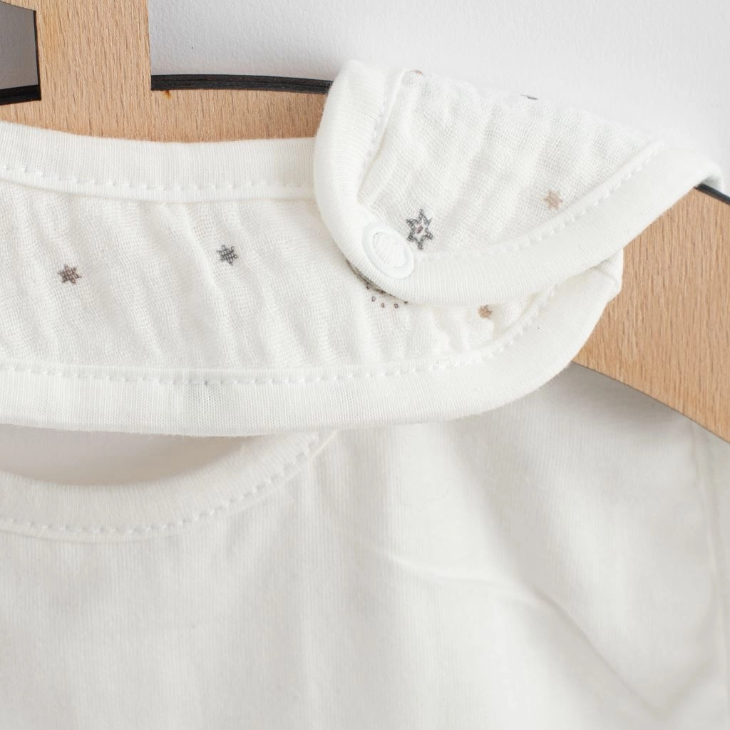 A muszlin az egyik legfinomabb és legtartósabb szövet – jól bírja a ismételt mosást, és idővel még puhábbá és kellemesebbé válik. Ez az előke remek választás a mindennapi használathoz otthon és útközben egyaránt.