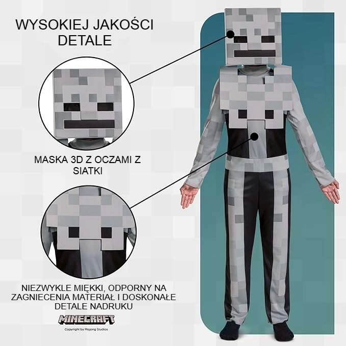 Változtasd kis játékosodat a Minecraft világának rettegett ellenfelévé! A fehér változatú Skeleton jelmez hűen másolja a játékbeli karakter megjelenését, és remek választás iskolai farsangra, jelmezbálra vagy tematikus bulikra. A könnyű anyagnak köszönhetően kényelmes viselet, és szabad mozgást biztosít játék közben.
