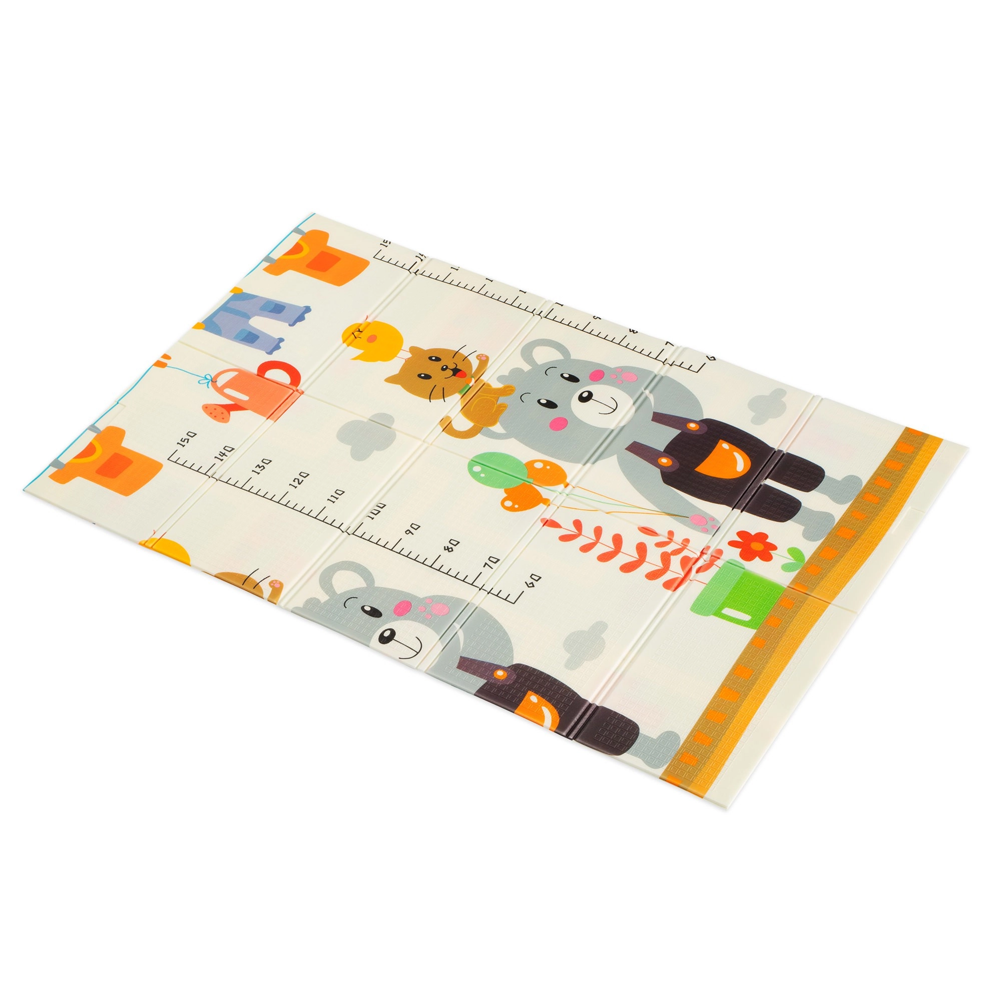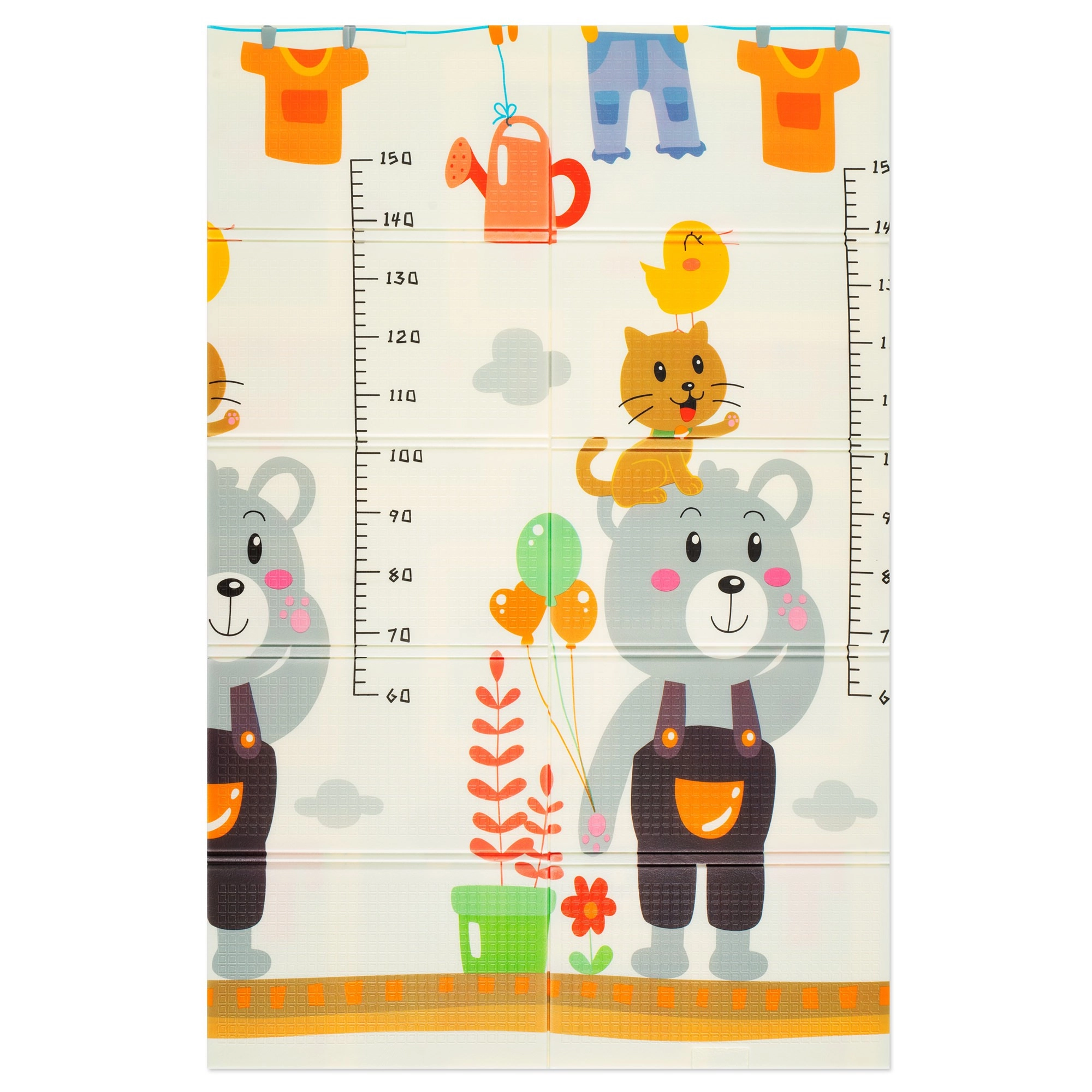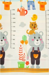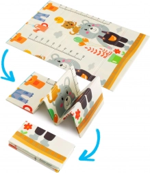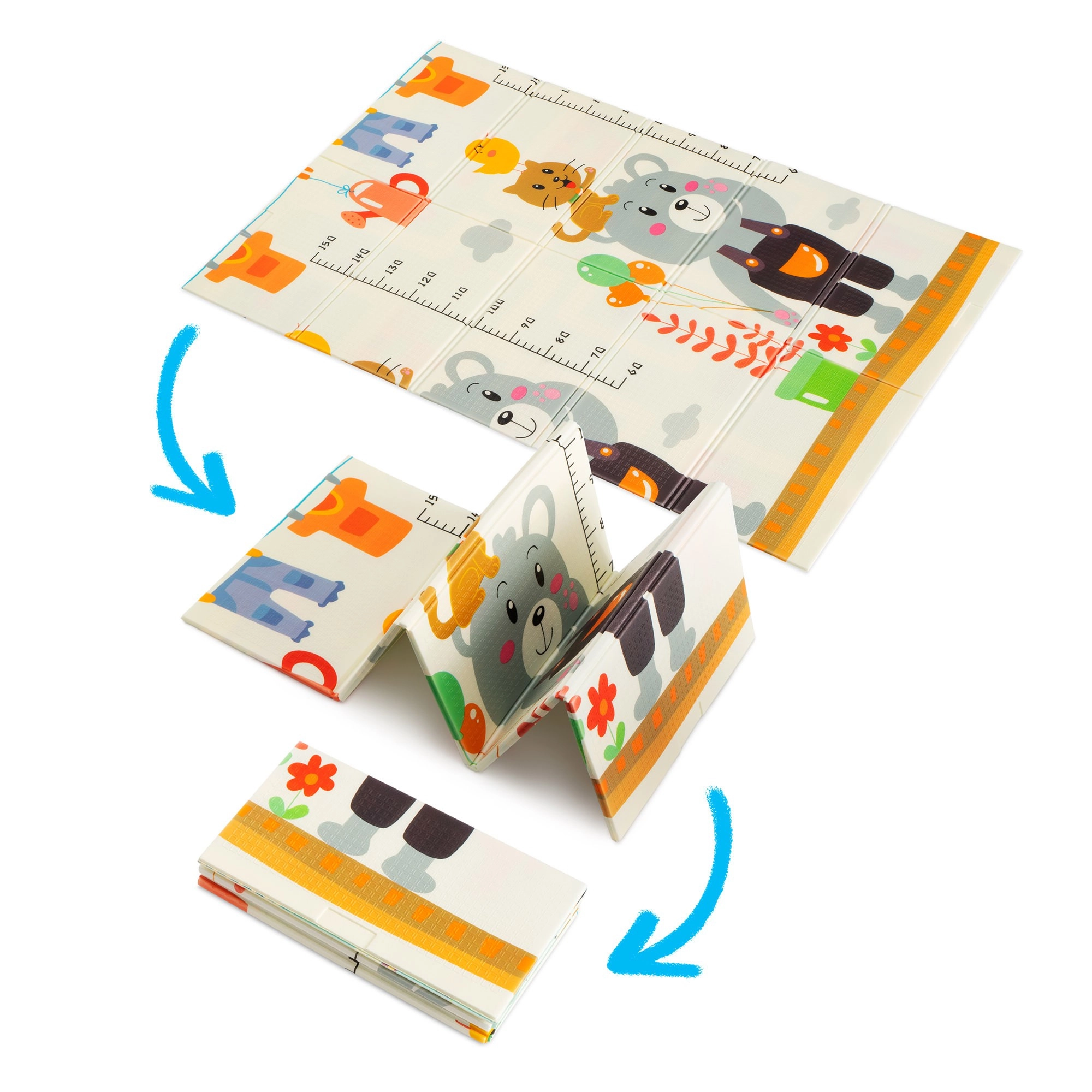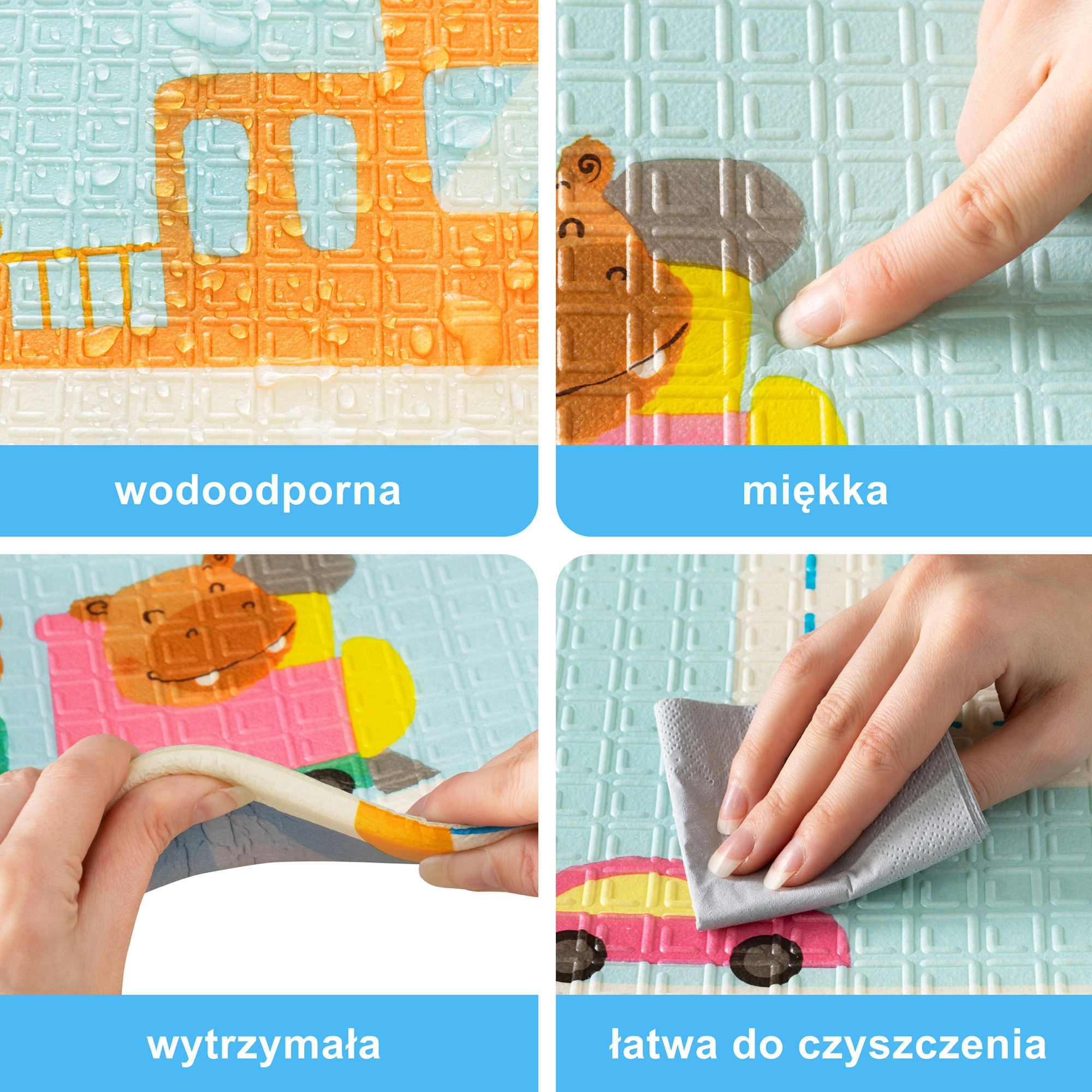 A kétoldalas dizájn két edukatív mintát kínál: vidám állatok magasságmérővel a növekedés követéséhez, valamint színes utak épületekkel és járművekkel a fantázia fejlesztésére. A szőnyeget néhány másodperc alatt összehajtod, könnyen elrakod, és a mellékelt cipzáras táskának köszönhetően bárhová magaddal viheted – nappaliba, gyerekszobába, erkélyre, kertbe vagy utazáshoz.