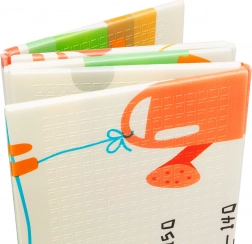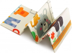 Az egyik oldalon vidám állatos motívumok magasságmérővel, a másikon színes utak és épületek a képzelet és az érzékelés fejlesztéséhez.