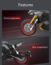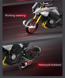 A mozgó elemeknek köszönhetően az építés és a bemutatás is élmény: a modell forgatható kormánnyal, átlátszó, mozgó dugattyús motorral kapcsolva a hátsó kerékhez, működő lánccal, háromfokozatú váltóval, funkcionális rugózással és állítható állvánnyal rendelkezik. Nem hiányzik a fényszóró, tükrök, műszerfal, féktárcsák és a precízen formázott idomok sem.