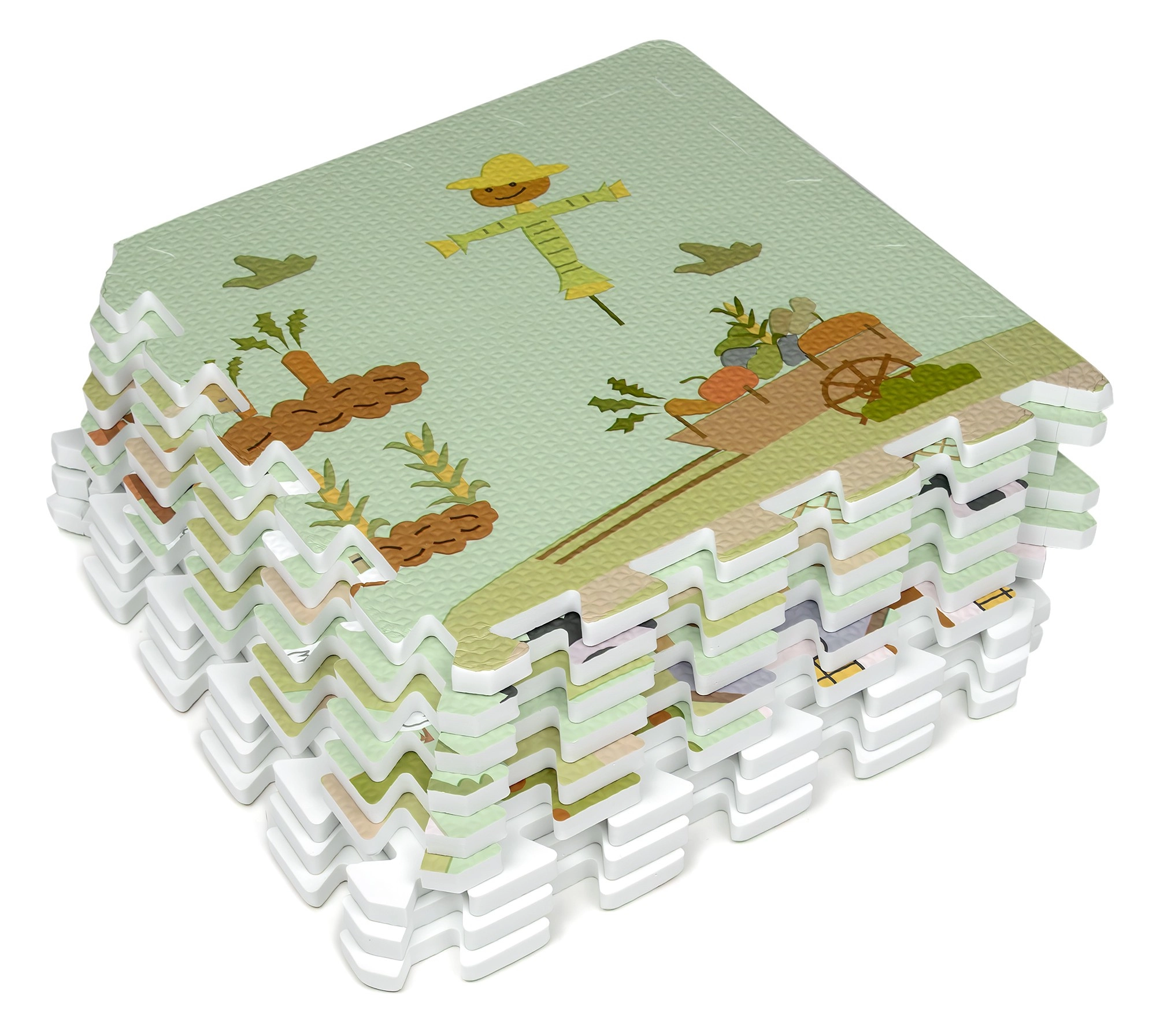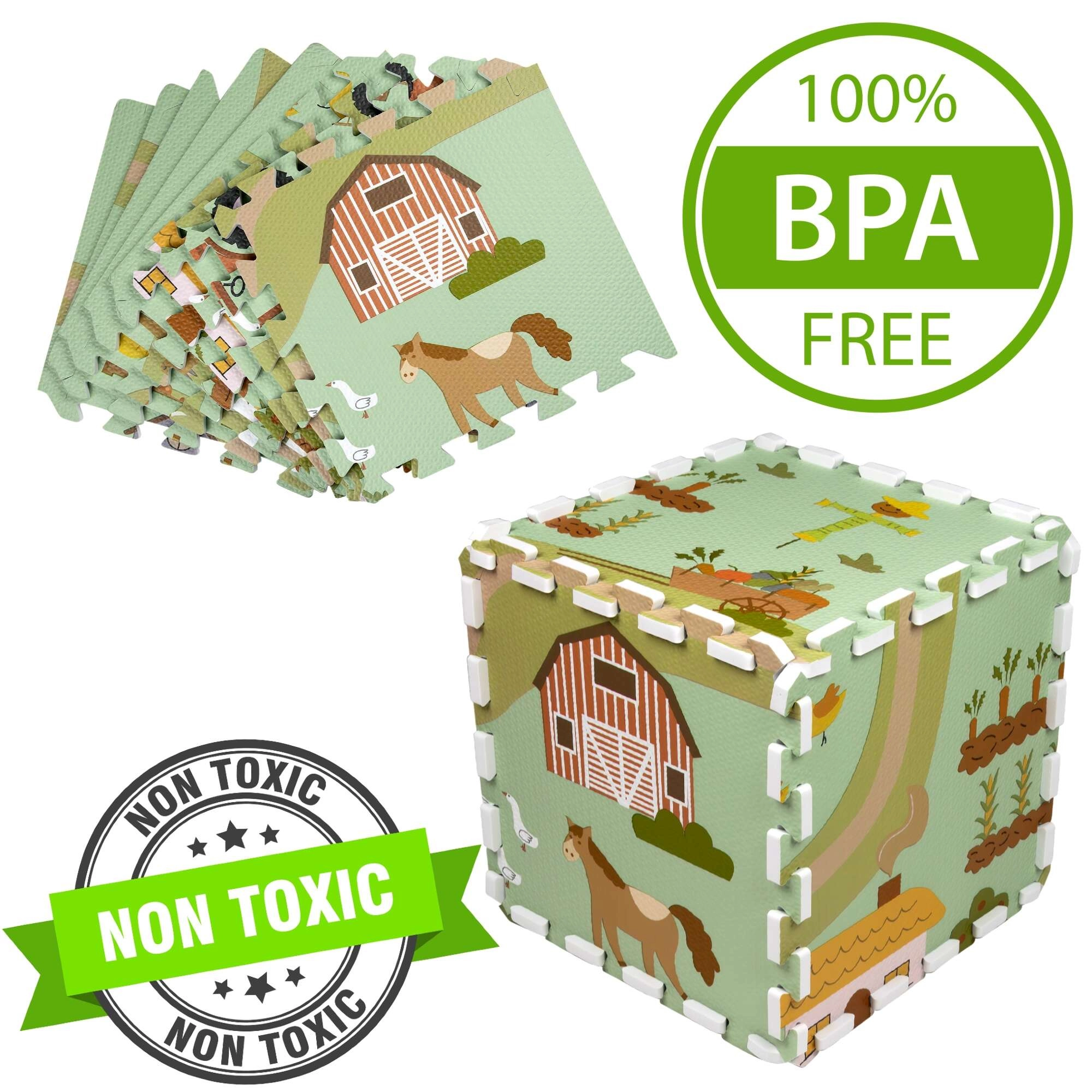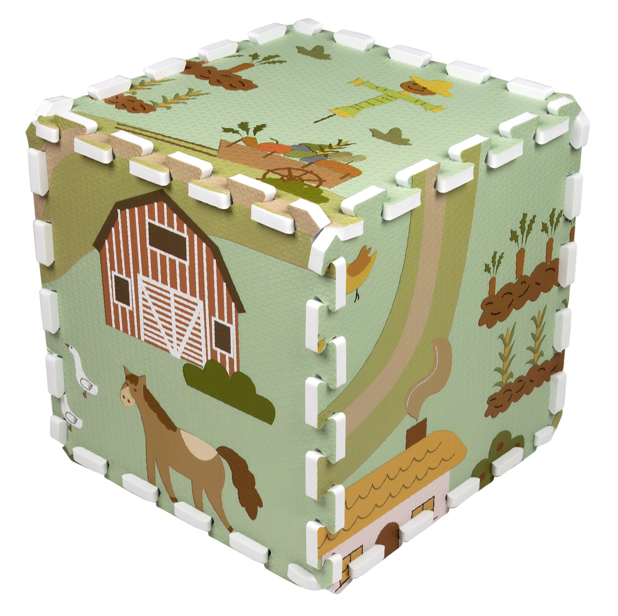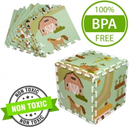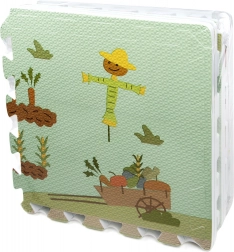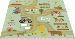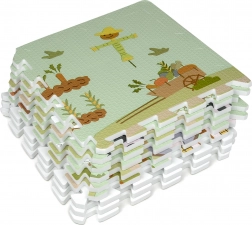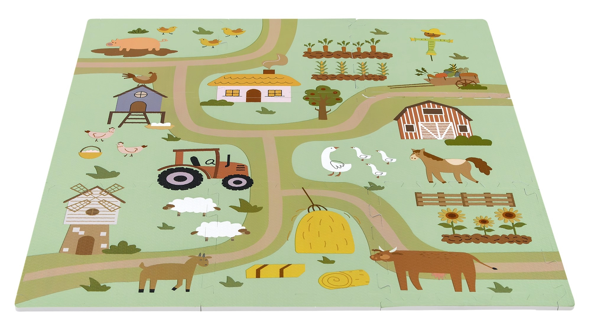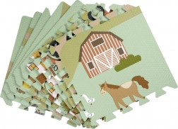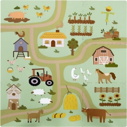 A 30 × 30 cm-es elemek pontosan illeszkednek egymáshoz, így könnyen nagyobb felületté kapcsolhatók, vagy térbeli formák hozhatók létre, például kocka. A gazdag minta – vidéki utak, traktor, pajta és állatok – ösztönzi a fantáziát, és kiváló autópályaként kisautóknak vagy figurák díszleteként szolgál.