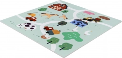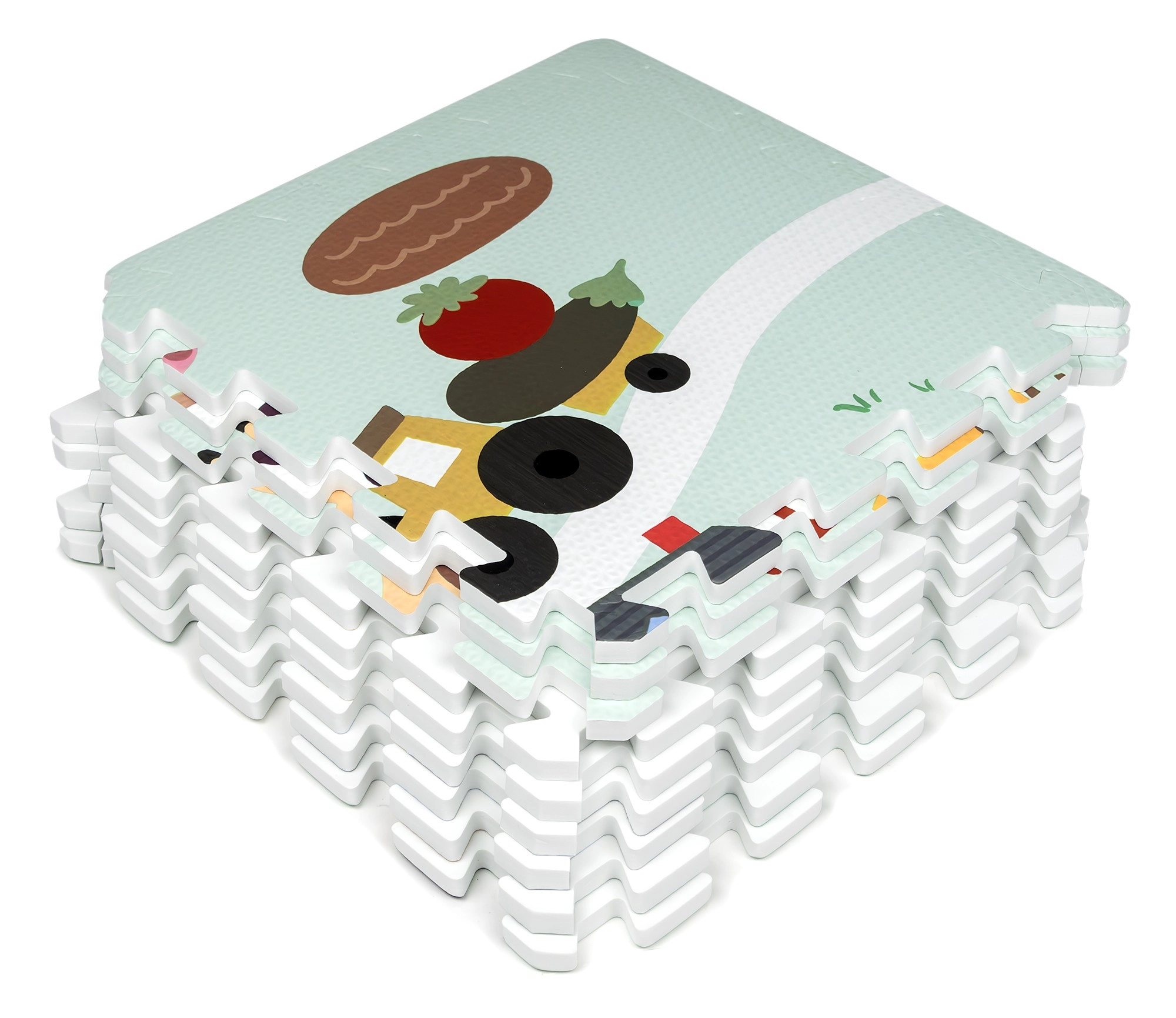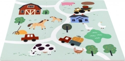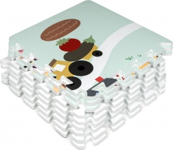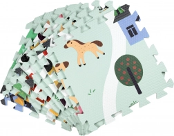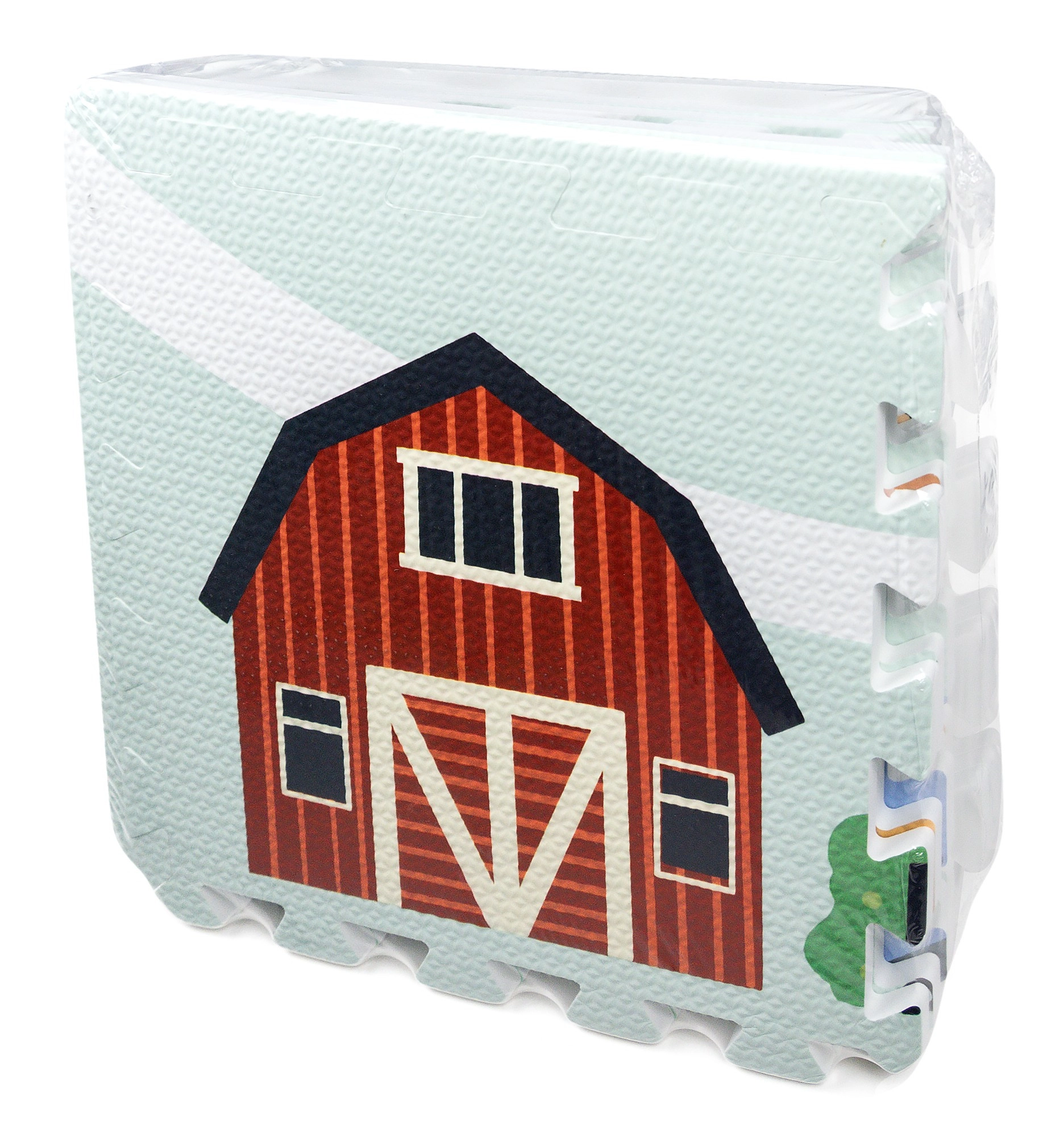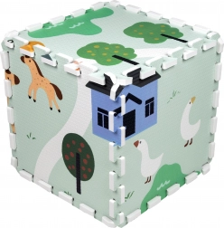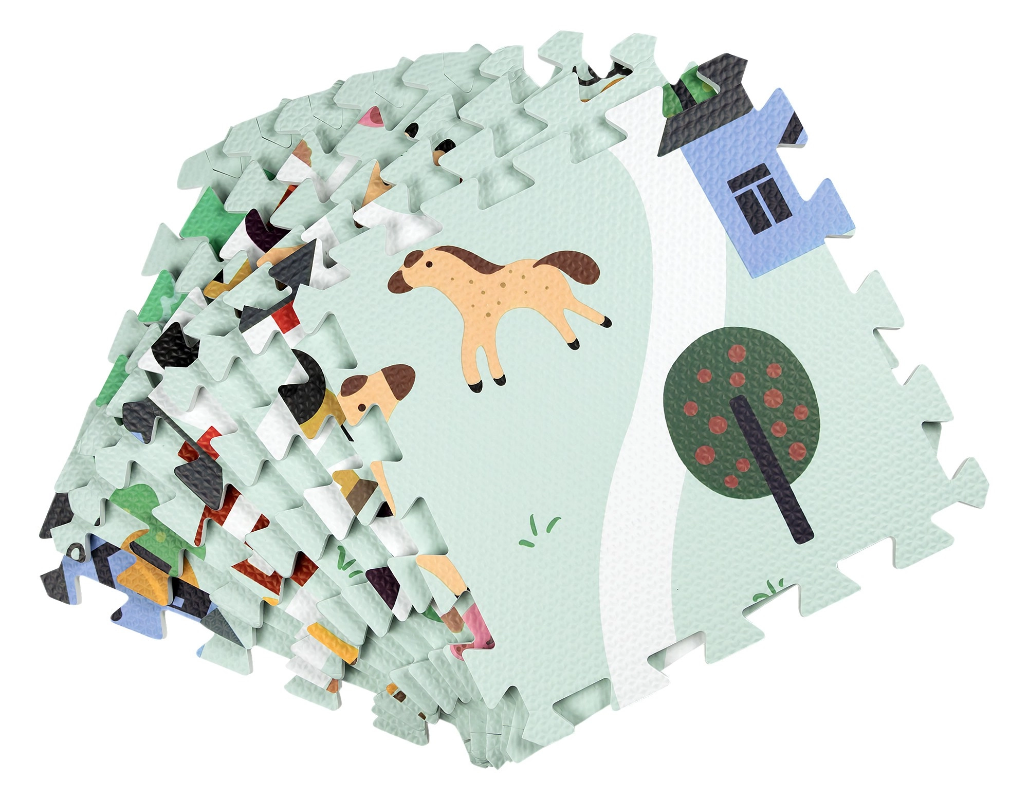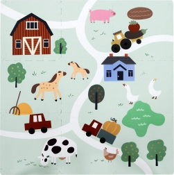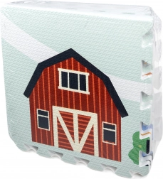 Puha és biztonságos gyermek játékmatrac EVA habból, 9 darabból áll, 30 × 30 cm-es elemekkel, tanyamintával. Biztosít védelmet a hideg ellen, ütéscsillapítást és csúszásmentes felületet. Vízálló, könnyen tisztítható, és a peremelemeknek köszönhetően az elemekből nagyobb felület vagy 3D formák (pl. kocka) építhetők. Újszülött kortól alkalmas, ftalát-, formamid-, PVC- és BPA-mentes, megfelel az EN 71 és a REACH szabványoknak.