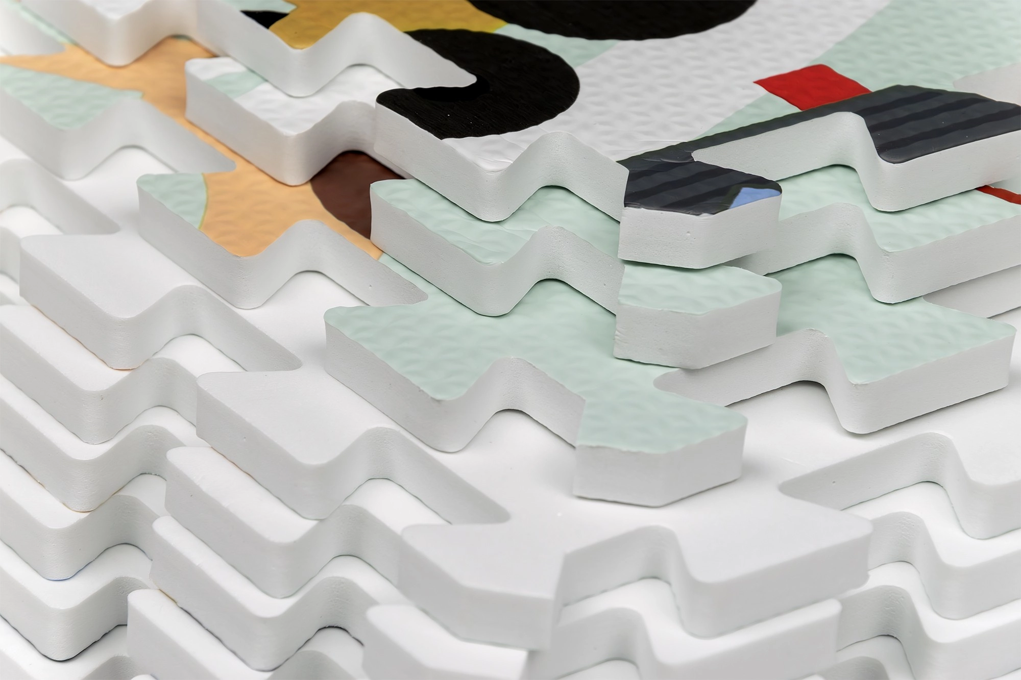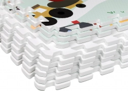 A szőnyeg rugalmas EVA habból készül, káros anyagok nélkül (ftalát-, formamid-, PVC- és BPA-mentes). A vízálló felület nedves kendővel letörölhető – nem szívja magába a port és az atkákat, ezért allergiásoknak is ideális. A 1 cm vastagságnak köszönhetően kiválóan szigetel a hideg padlótól, és csillapítja az ütközéseket kemény felületeken (parketta, csempe, laminált).