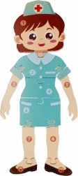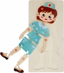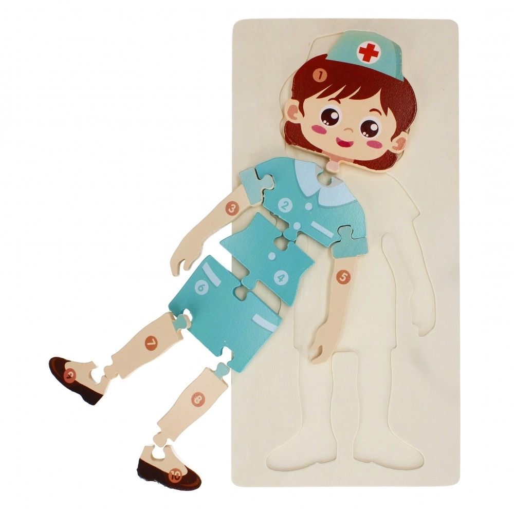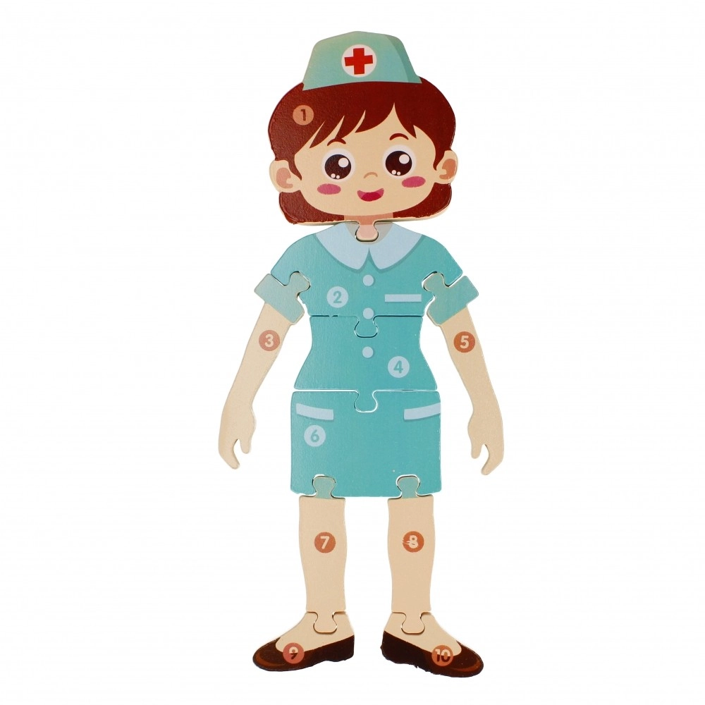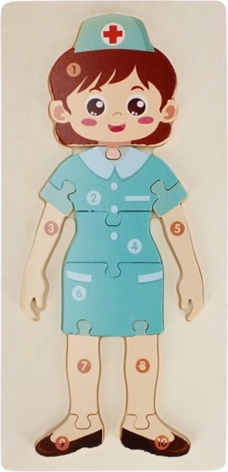 A Nővérke fa puzzle ideális fejlesztő játék óvodás gyerekeknek. Az egészségügyi nővért ábrázoló figura alakú darabok segítik a finommotorika, a szem–kéz koordináció és a logikus gondolkodás fejlesztését. A kellemes faanyag és a lekerekített élek révén az összerakás kényelmes és biztonságos.
