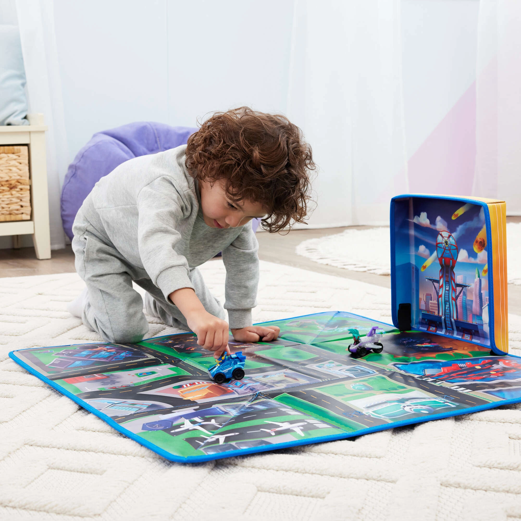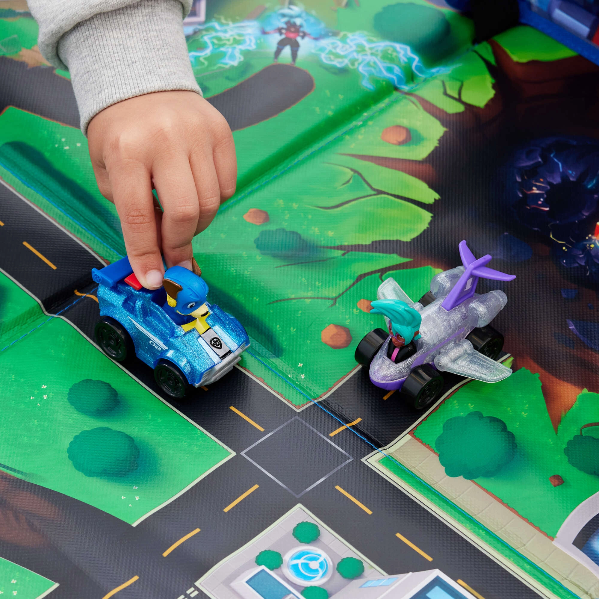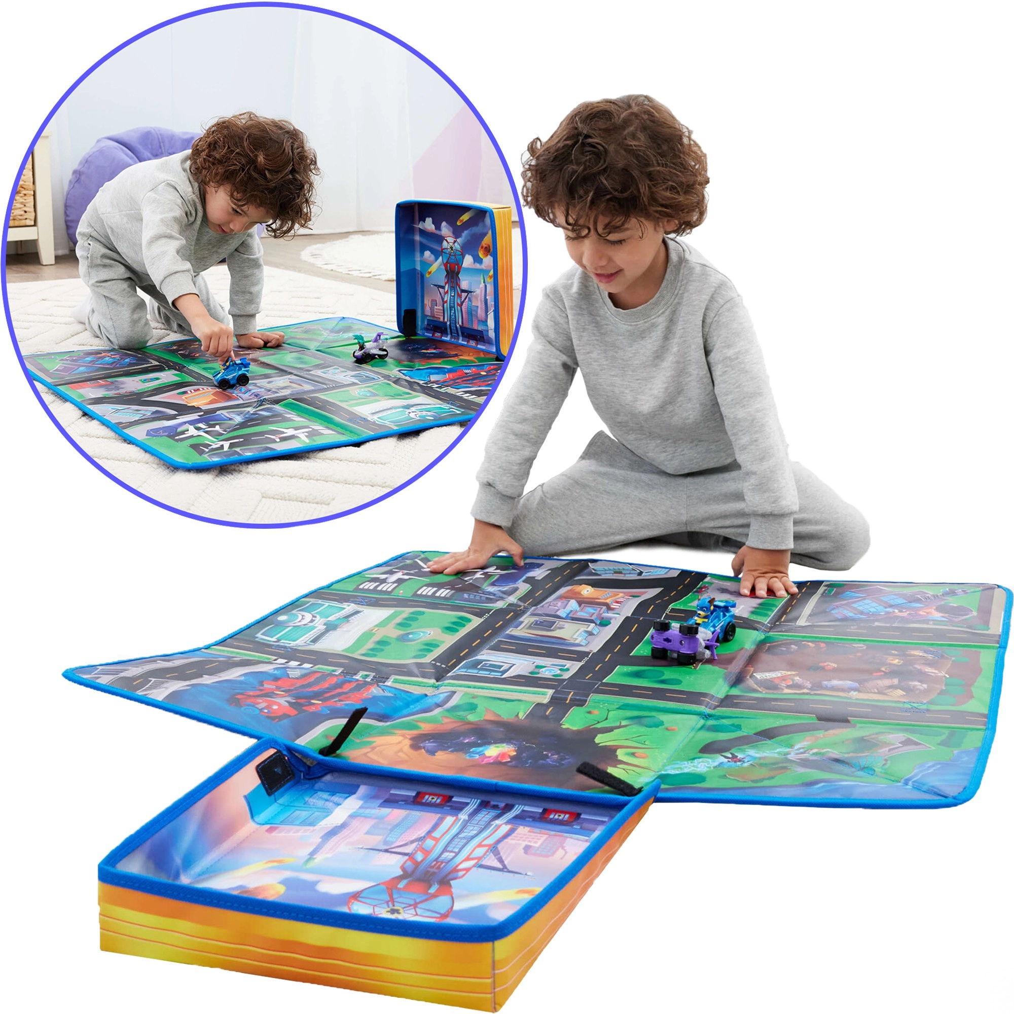 Játék után a szőnyeg pillanatok alatt átalakul egy stabil tárolódobozzá (25,4 × 25,4 × 25,4 cm), amelybe autók és figurák is beleférnek. A csomagban megtalálható a Chase Rescue Racer jármű és az exkluzív Vee Rescue Racer jármű is, így a játék azonnal kezdődhet a kicsomagolás után.