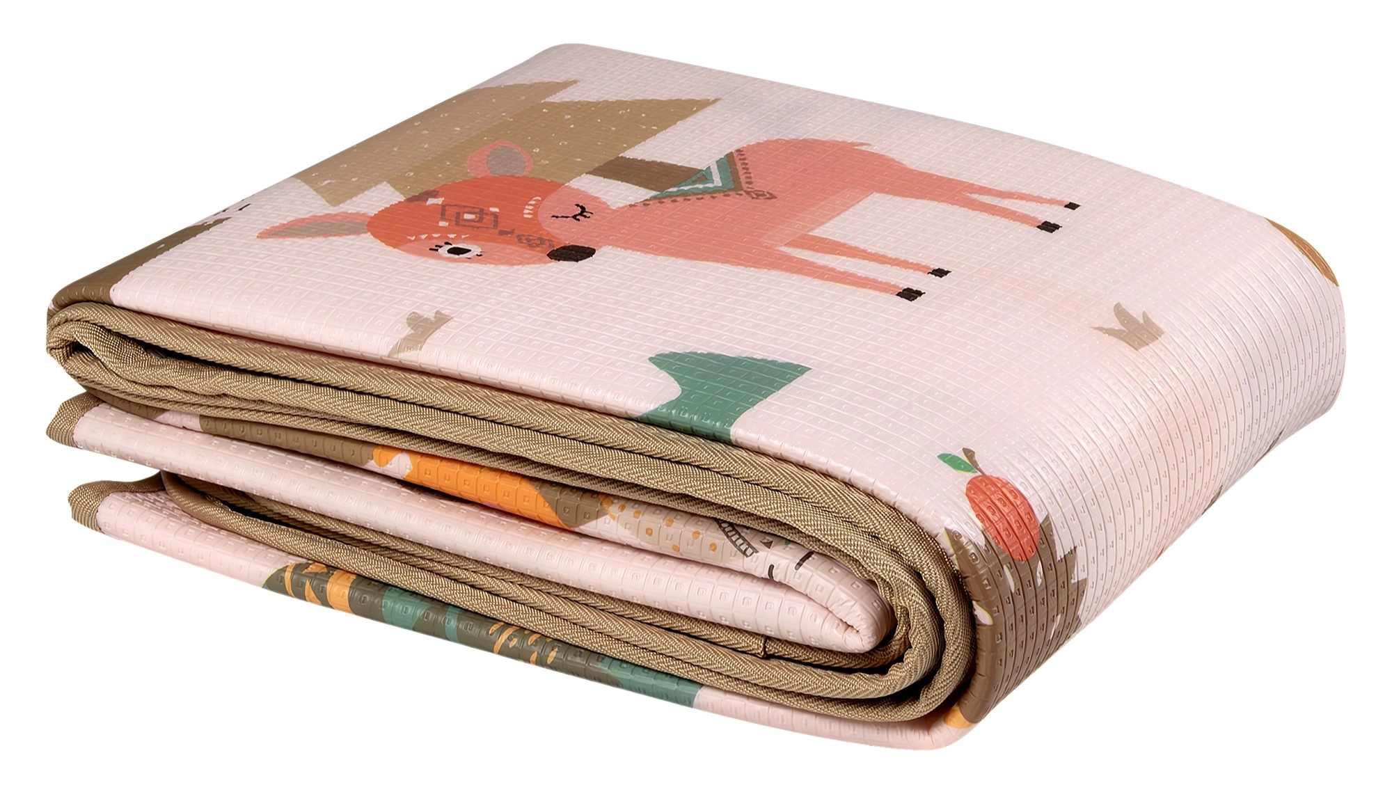 A szőnyeg gyorsan kompakt formára hajtható, elfér a kiságy alatt vagy a bútorok között. A csomag része egy cipzáras, füles táska a tiszta és kényelmes szállításhoz.
