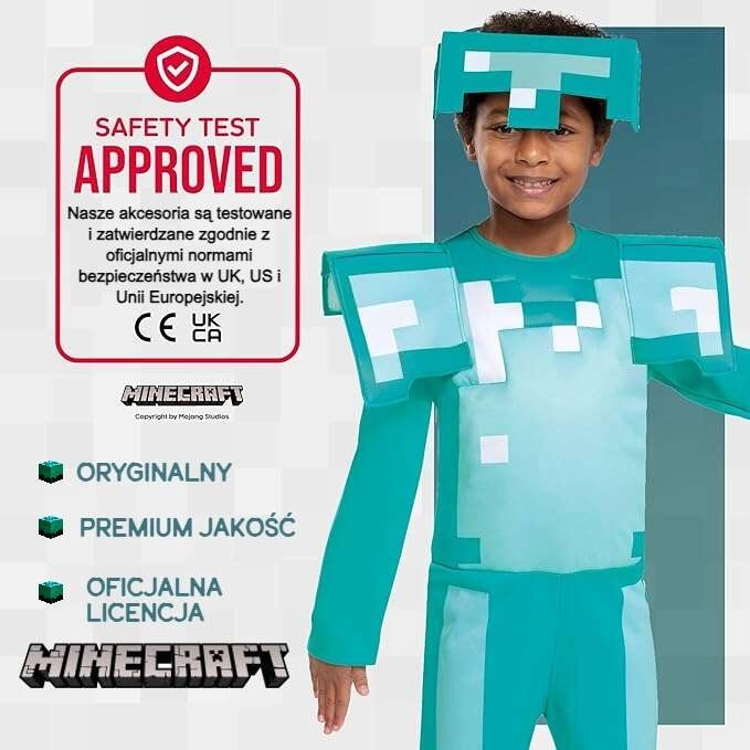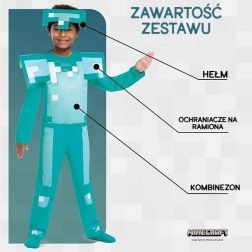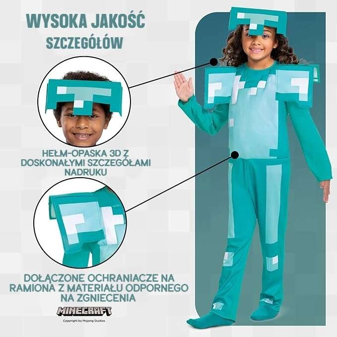 Ez a hivatalosan licencelt MINECRAFT gyémánt páncél jelmez a gyerekeket kedvenc játékuk hőseivé változtatja. A pixeles mintázatú puha overált és a markáns vállpaneleket könnyű sisak egészíti ki, amely ikonikus megjelenést ad a jelmeznek. A kellemes anyagoknak köszönhetően hosszabb viselés során is kényelmes.