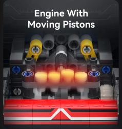 A nyitható paneleken át betekinthetsz a motortérbe a mozgó dugattyúkkal ellátott, kidolgozott motorhoz, emellett működő kormányzás és mindkét tengelyen felfüggesztés gondoskodik a sima mozgásról különböző felületeken. A gumírozott abroncsok biztos tapadást adnak, a modell pedig polcon és játék közben is remekül mutat.
