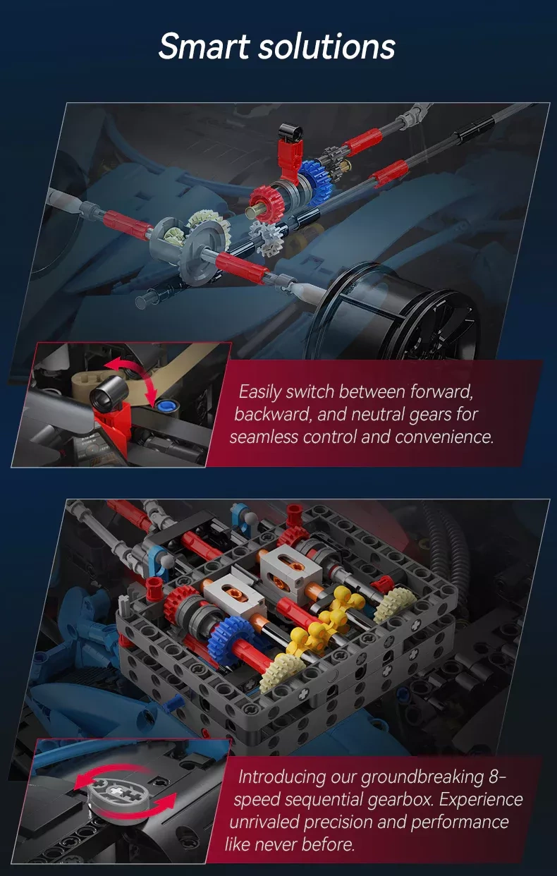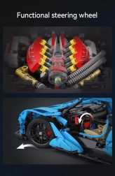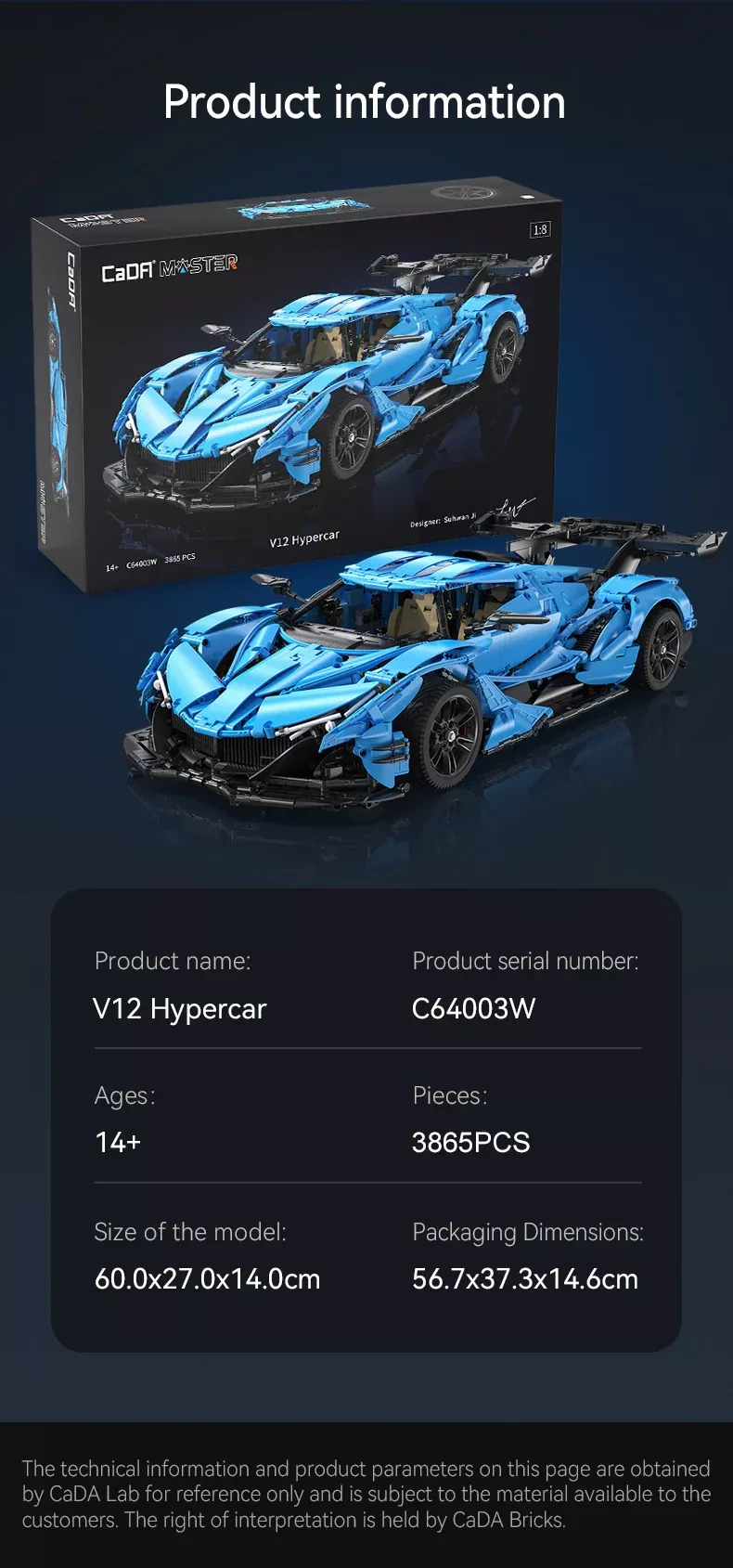 Ez a nagyméretű V12 hiperautó modell a CADA Master sorozatból minden technikai építőkészlet-rajongónak örömet okoz. Építés közben átgondolt mechanikus megoldásokat élvezhet, amelyek a valósághű élményt erősítik: a működő kormányzástól a nyitható ajtókon át a hiteles pilótafülke-részletekig. Elegáns kék karosszériájának köszönhetően bármely gyűjtemény feltűnő dísze lesz.