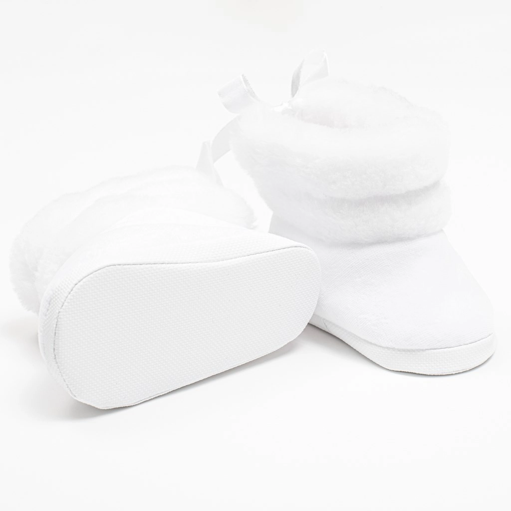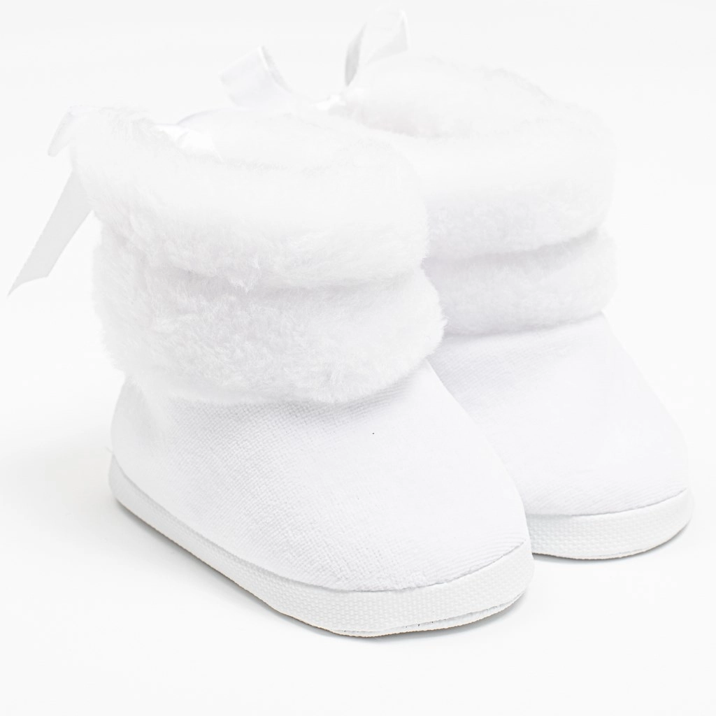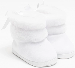 Aranyos és praktikus New Baby téli babacsizma fehér színben, 0–3 hónapos babáknak. Puha és meleg, velúrból készült, finom wellsoft béléssel a maximális kényelemért. A fűzőnak köszönhetően jól tart a lábacskán, széles belső térrel rendelkezik a szabad lábujjmozgáshoz, és ultrakönnyű, vékony talppal készül. Tökéletes télen babakocsiba – nem járásra készült.