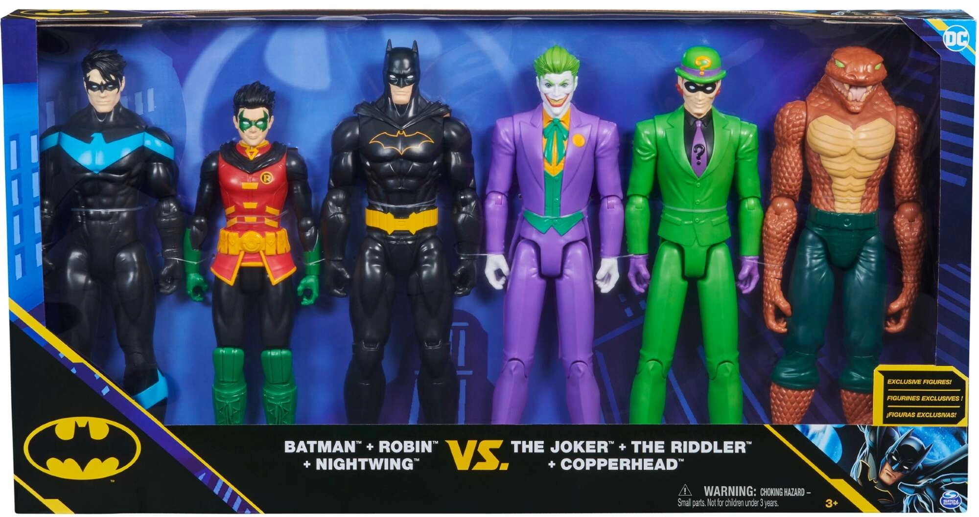 A kb. 28 cm magas figurákat úgy tervezték, hogy bírják a mindennapos játékot, ugyanakkor remekül mutassanak a polcon. A szett tartalma: Batman fekete‑sárga öltözetben köpennyel, Robin maszkkal, Nightwing fekete-kék részletekkel, Joker ikonikus lila öltönyben, Rébusz zöld öltözetben „?” motívummal és Copperhead farokkal.