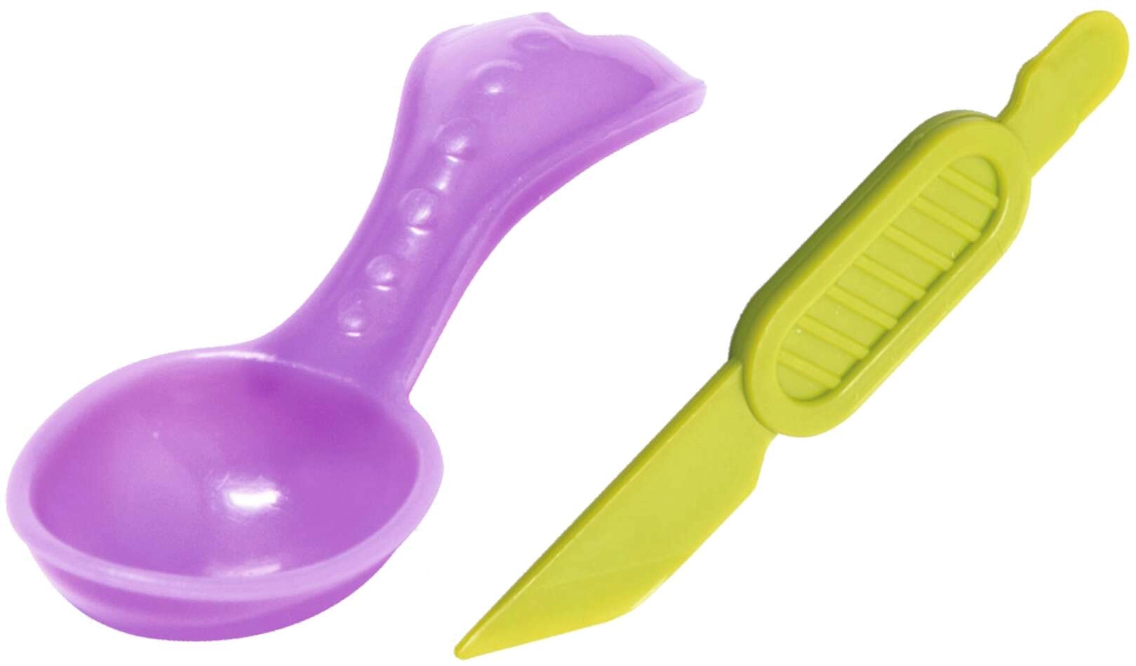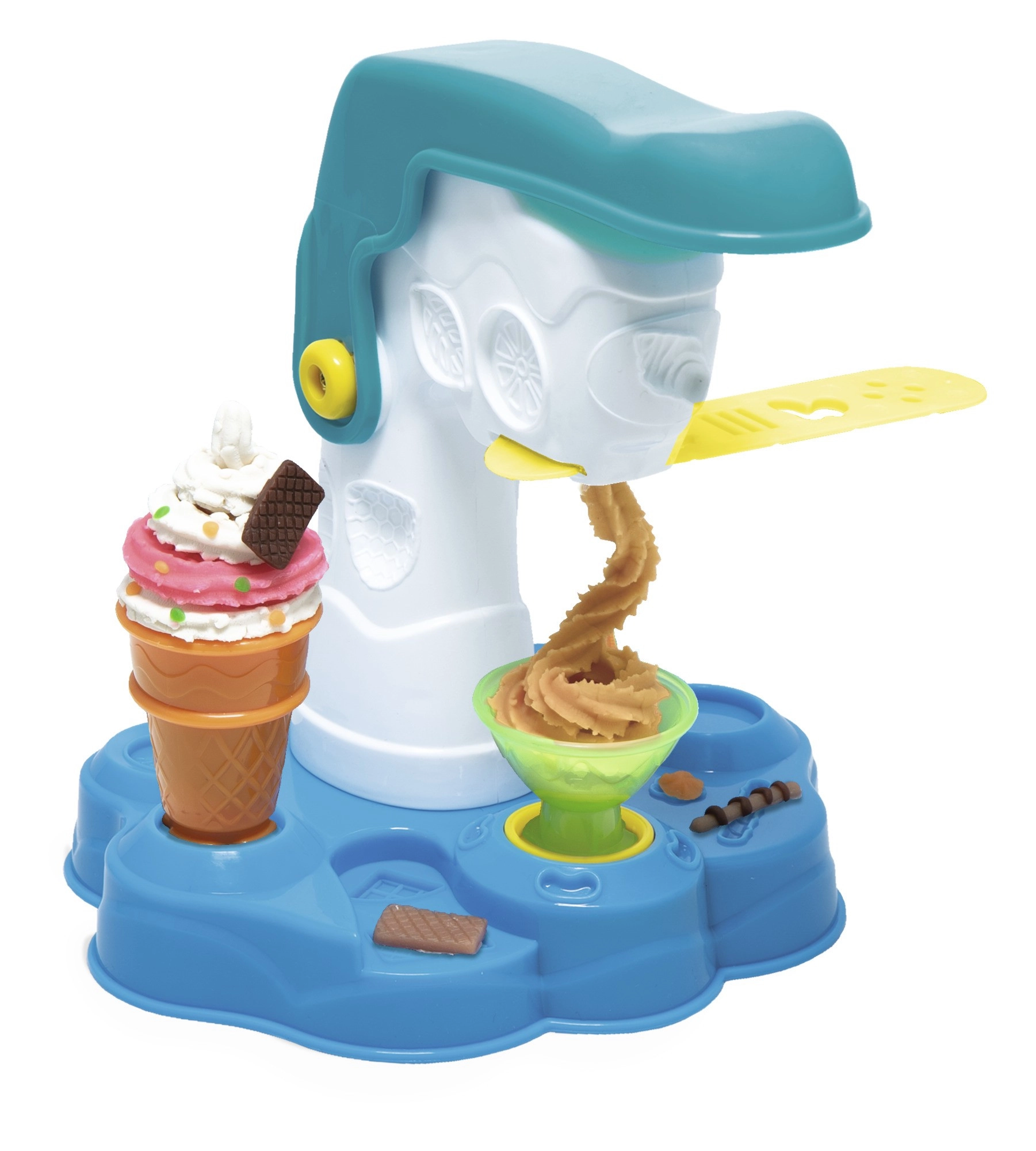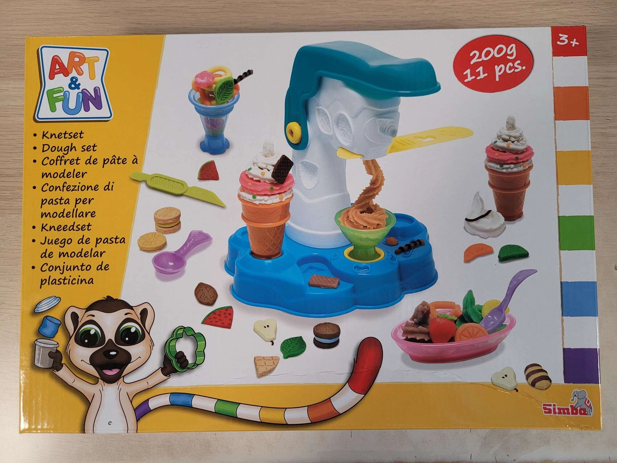 - Állomás extruderrel, fagylalt- és díszítőformák, poharak és tálkák, kanál, biztonságos kis kés, 4 tégely gyurma