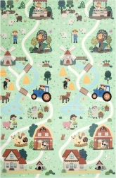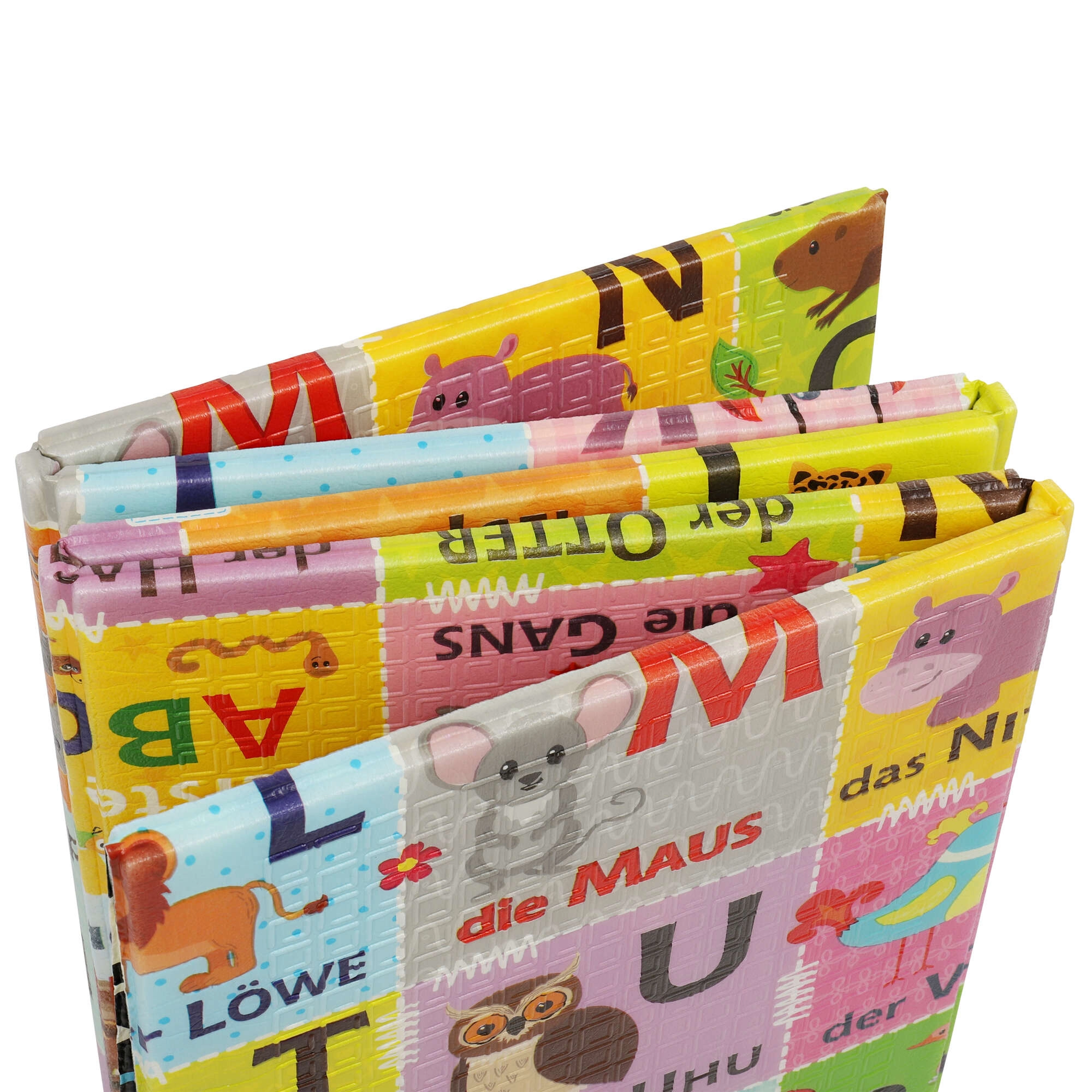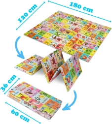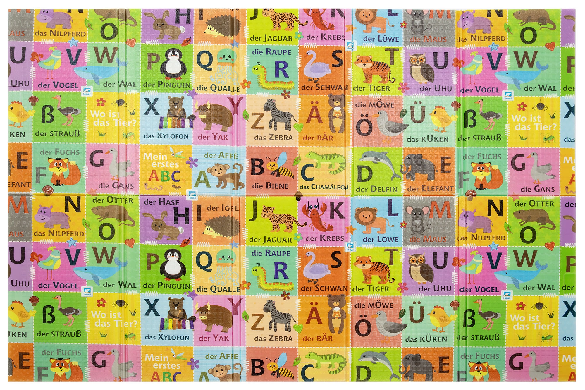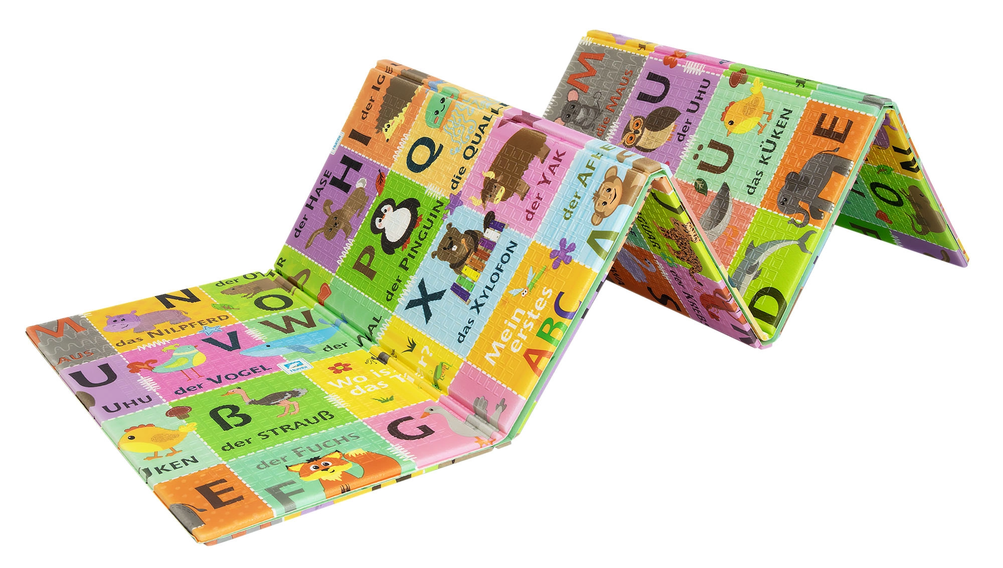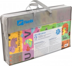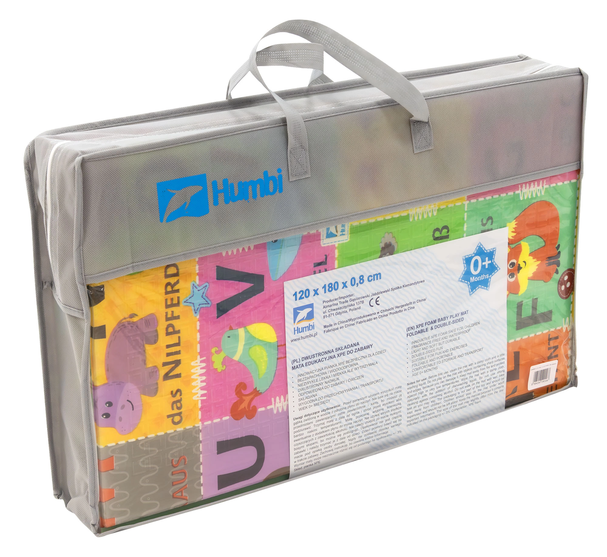 A HUMBI szőnyeg minőségi, szagtalan XPE habból készül, tartós, rugalmas és kellemesen puha. A kétrétegű kialakítás két oktató grafikát kínál – német ábécét képekkel és farmélet motívumot a fantázia fejlesztéséhez. A 120 × 180 × 0,8 cm-es méret bőséges helyet nyújt játékhoz, mászáshoz és az első lépésekhez.