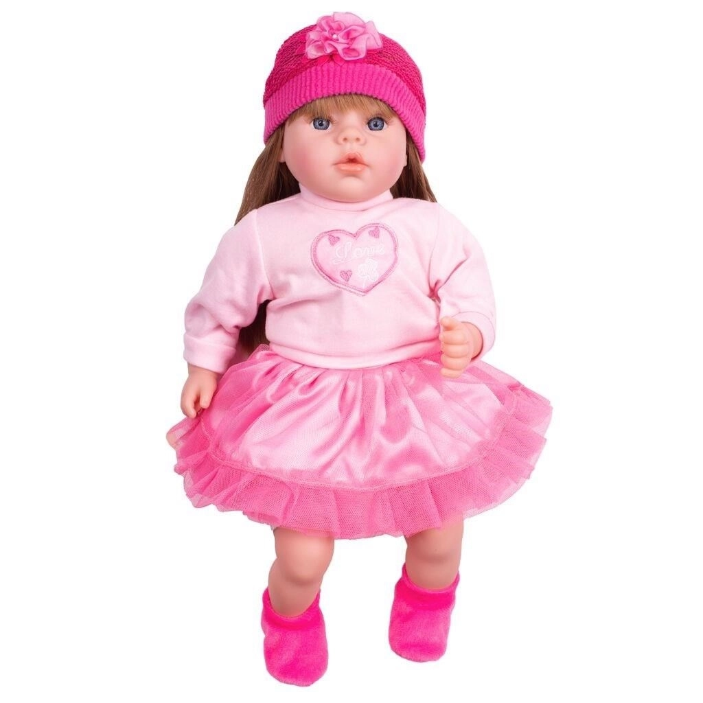 Tartozik hozzá virágos sapka, szívecskés póló, tüll szoknya és puha cipőcskék. A ruhák levehetők és moshatók.