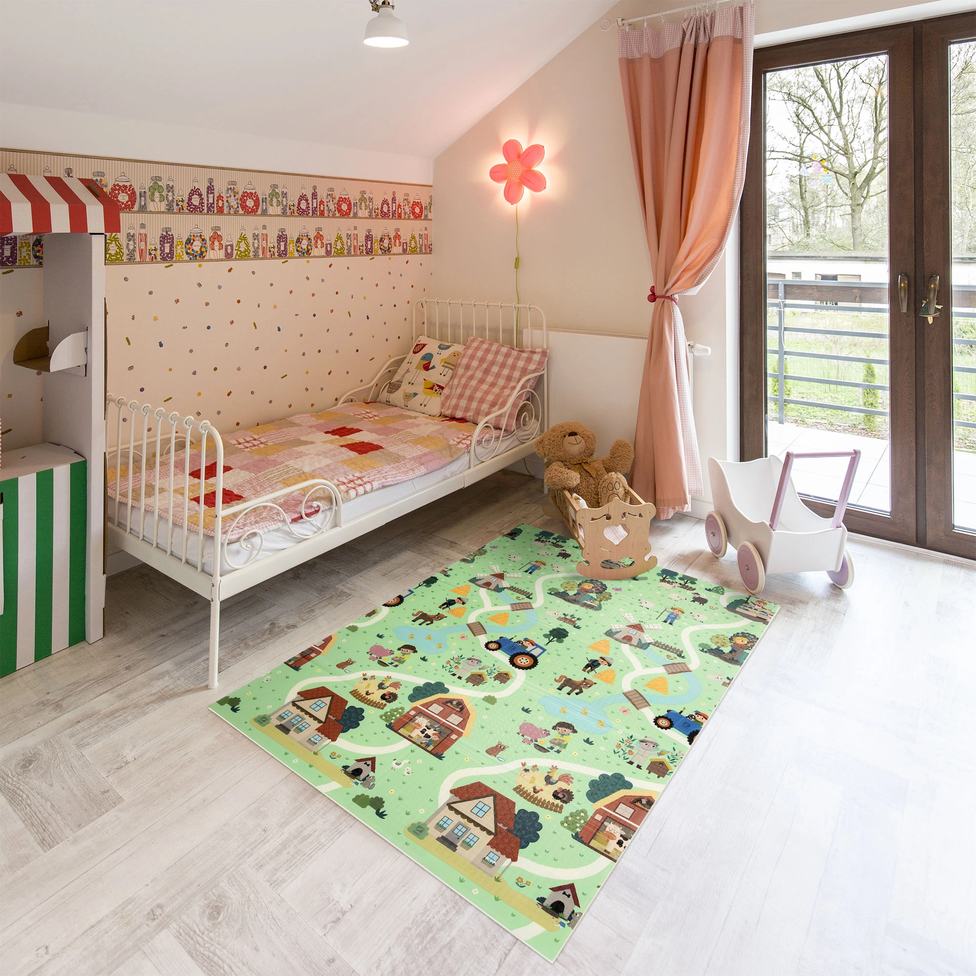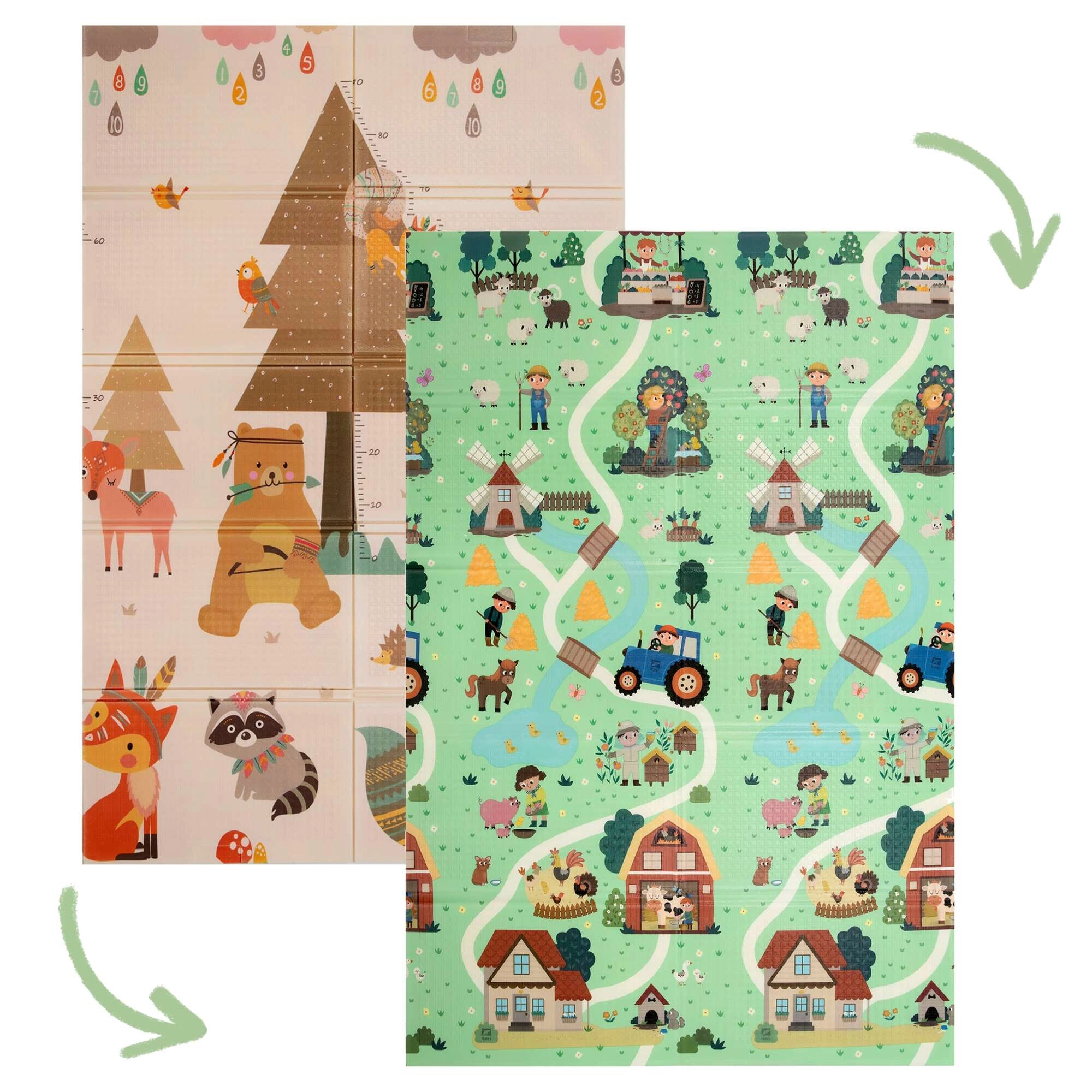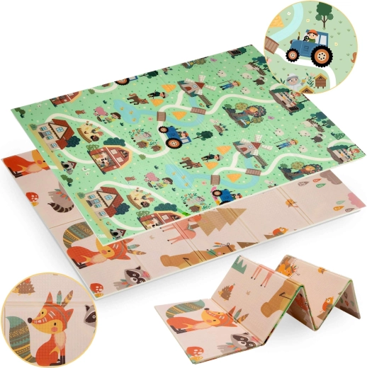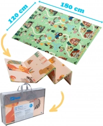 Az egyik oldal erdei állatokat, a másik falut és kisautóknak való utakat ábrázol. Válts motívumot hangulat szerint, és támogasd a fantáziát és az érzékelést.