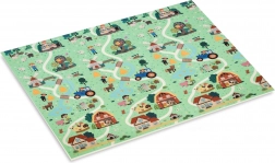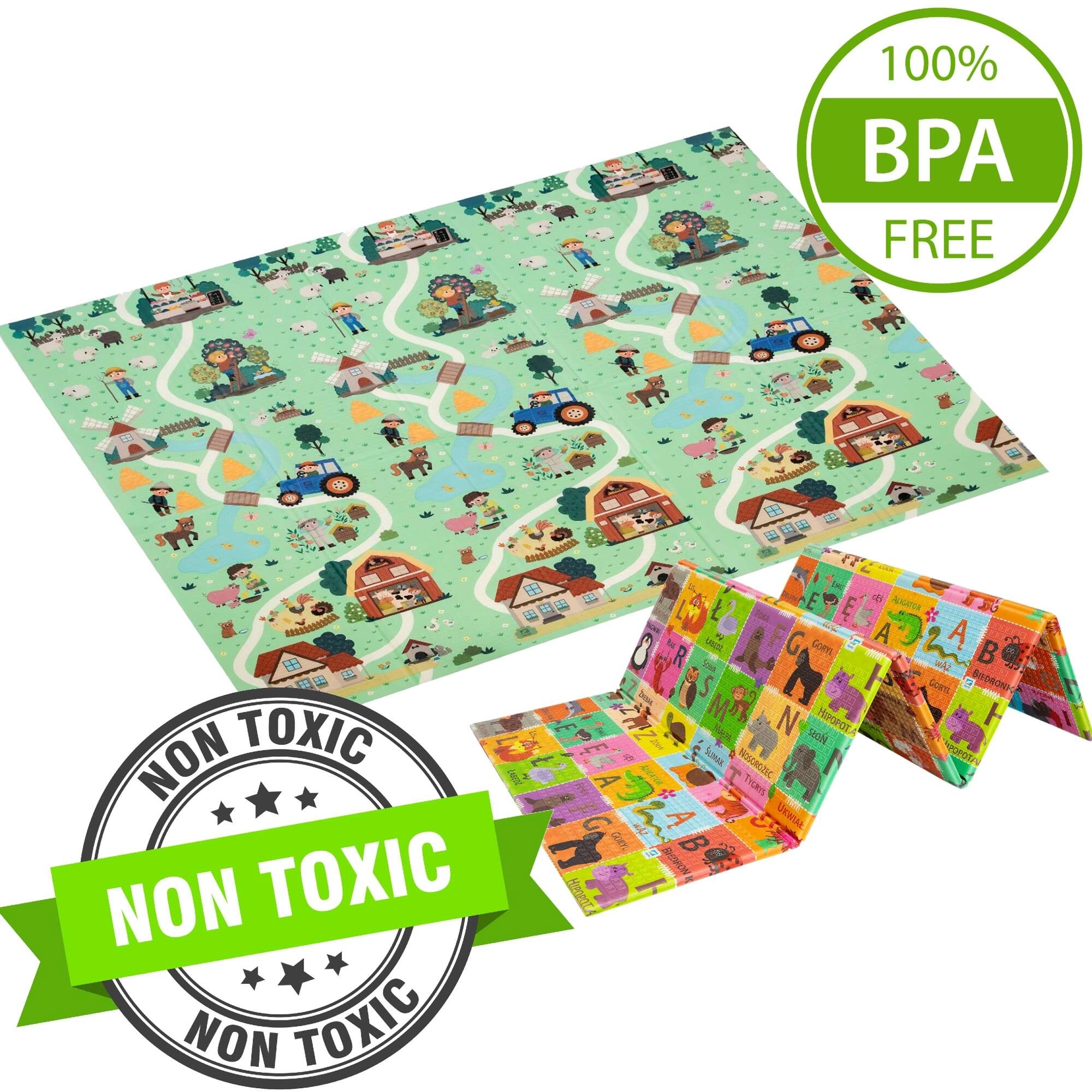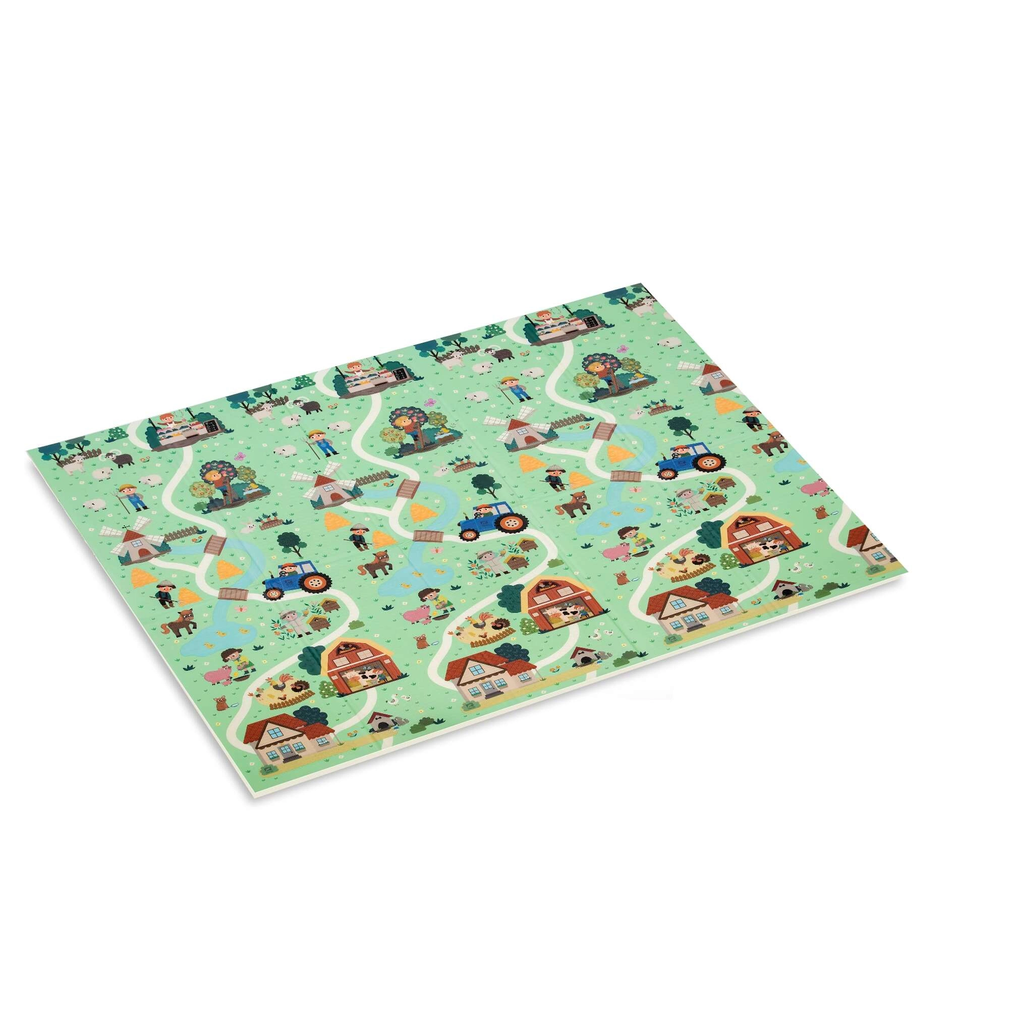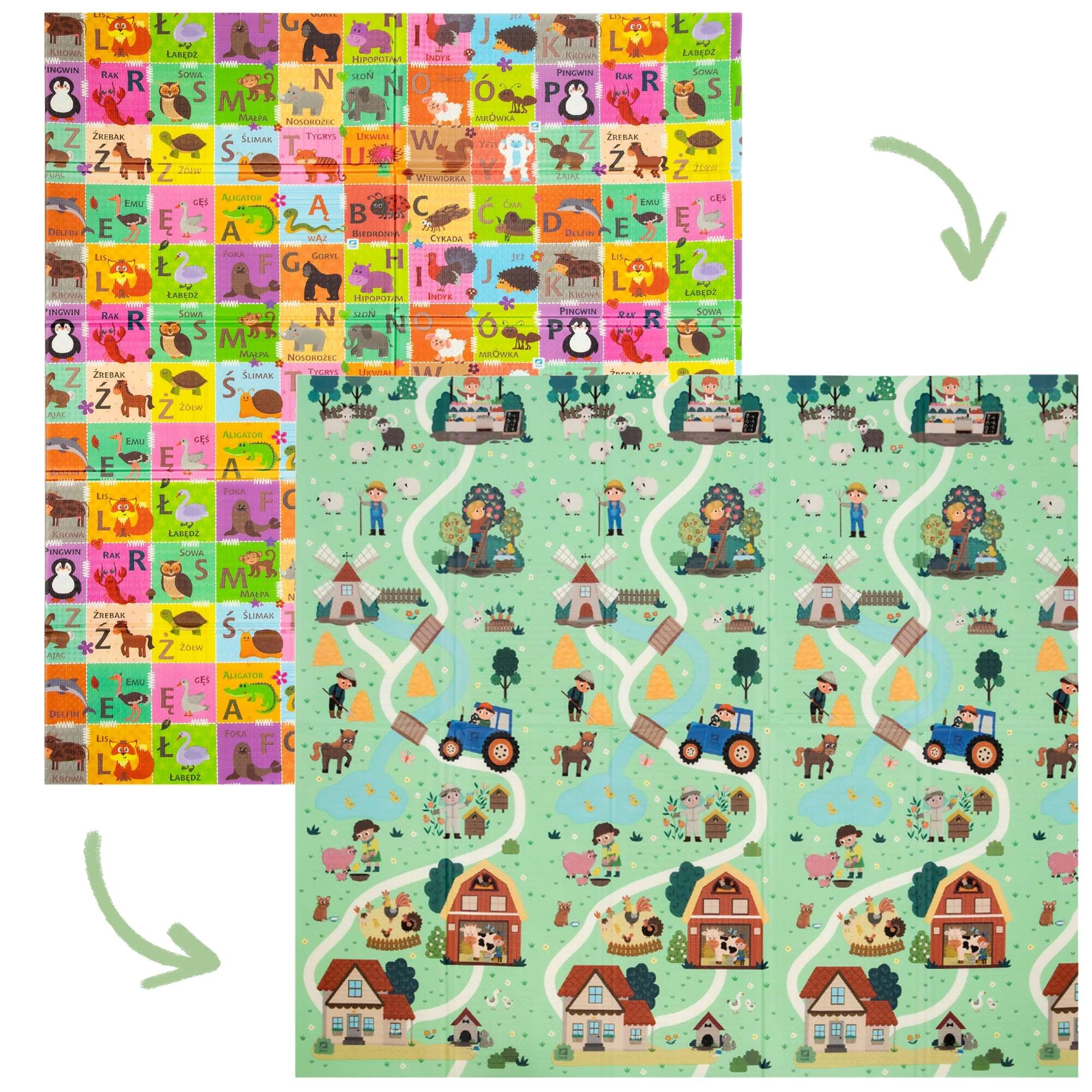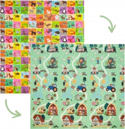 Az egyik oldal színes ábécével és állatokkal segíti a szókincs fejlesztését, a másik, tanyás és úthálózatos oldal pedig ideális kisautózáshoz és a fantázia kibontakoztatásához.