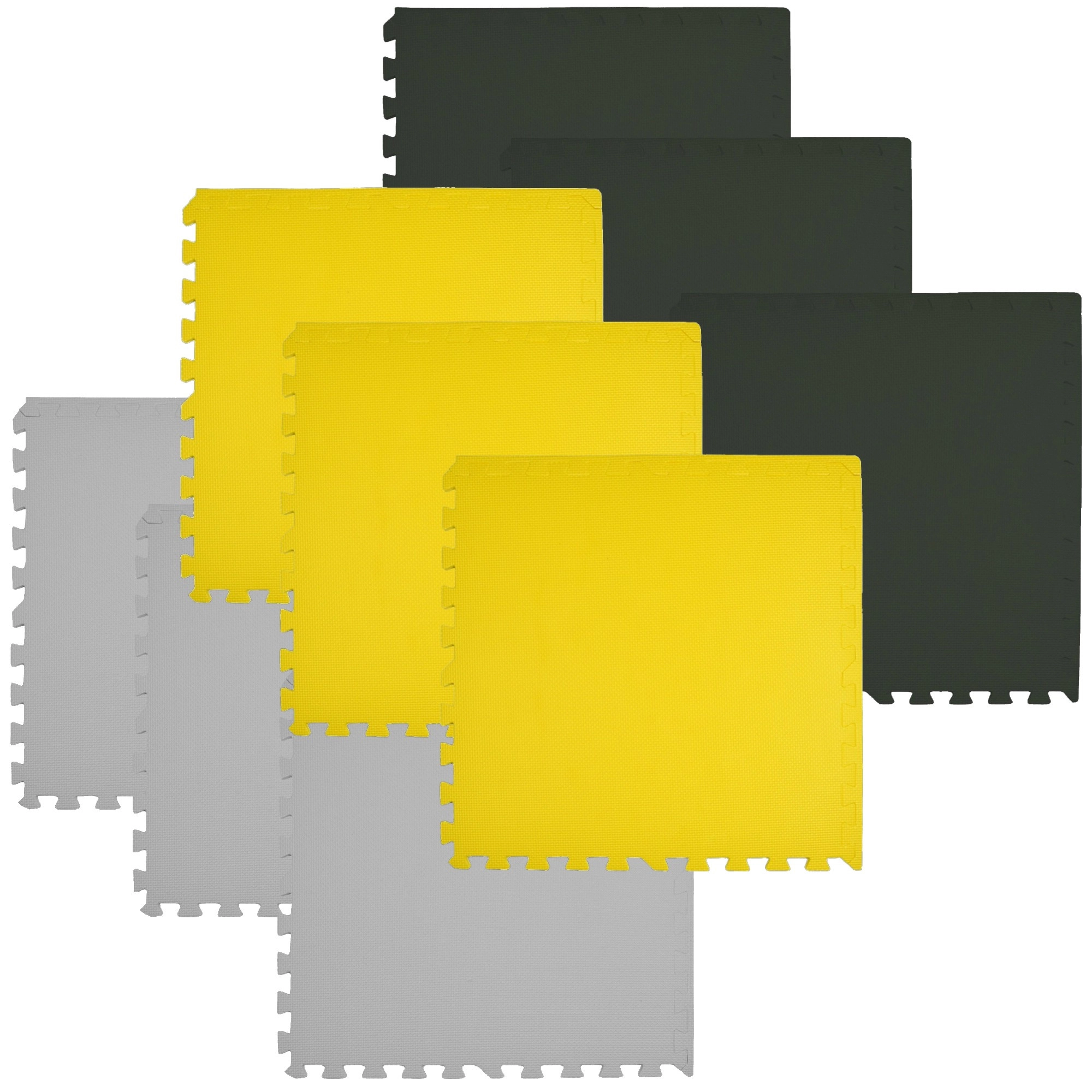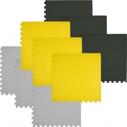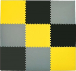 A HUMBI hab puzzle visszafogott sárga, szürke és fekete színekben variálható játéktérré alakítható. Az elemek pontosan illeszkednek, így gyorsan biztonságos helyet alakíthat ki bármilyen kemény padlón. Az 1 cm vastagságnak köszönhetően a szőnyeg szigetel a hidegtől és tompítja az eséseket, ami különösen hasznos az első ülési, mászási és járási próbálkozásoknál.