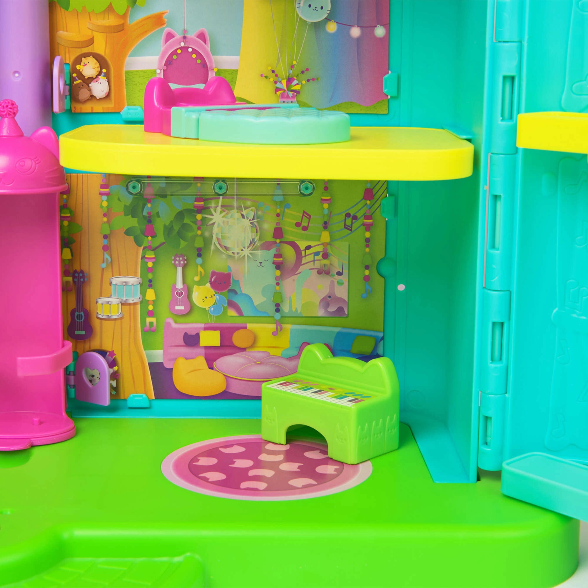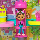 A nagy, szivárványos Gabby cicaház elhozza a GABBY’S DOLLHOUSE varázsát közvetlenül a gyerekszobába. A nyitható ház 6 szobával és forgatható tetővel titkos padlásteret rejt, amelyhez a Cat‑A‑Vator (mini lift) segítségével lehet feljutni. A gomb megnyomására 6 hangeffekt és dallam szólal meg a sorozatból – ideális a saját történetek megalkotásához.