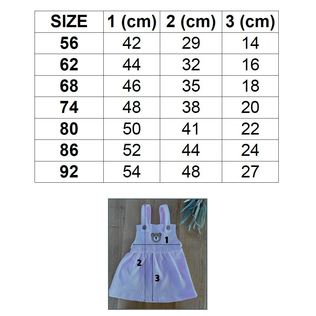Cuki és stílusos NEW BABY Laura gyerek kantáros ruha, kellemes tapintású 100% pamutból. Tökéletes a mindennapokra és az ünnepi pillanatokra is, puha kötött anyaggal, érdekes textúrájú anyaggal, mackó felvarróval és gombos zárással az egyszerű öltöztetésért.