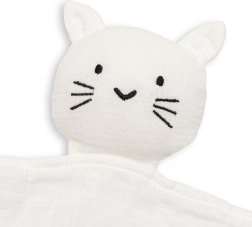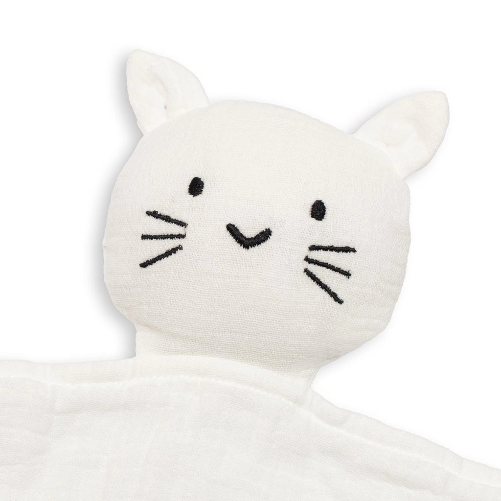 Puha muszlin alvókendő NEW BABY cicás formában – ideális első kedvenc a babának. Kellemes, organikus pamutból készül, biztonságérzetet nyújt és megkönnyíti az elalvást. A finom színeknek és a minimalista dizájnnak köszönhetően jól illik minden babakelengyéhez, és remekül passzol más muszlin termékekhez.