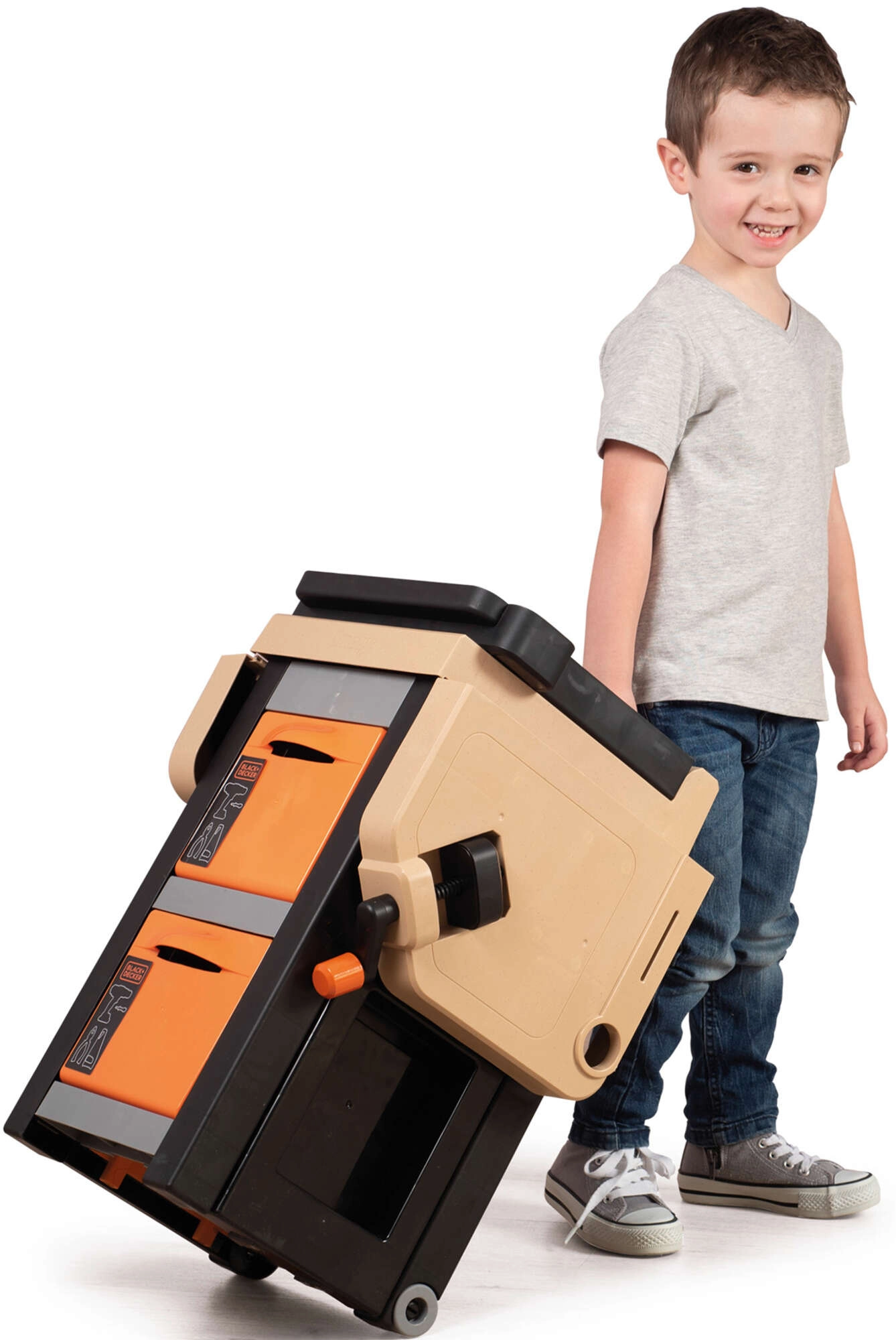 A nyitott Bricolo munkapad a BLACK+DECKER licenc alapján készült, így a gyerekek olyan eszközökkel dolgoznak, amelyek valódi szerszámokra hasonlítanak. A robusztus, fa hatású munkafelület, a szerszámállvány és pegboard, valamint a fiókok és polcok minden elemet áttekinthetően kéznél tartanak. A munkapad minőségre és tartósságra tervezett, ezért bírja a mindennapos játékot.